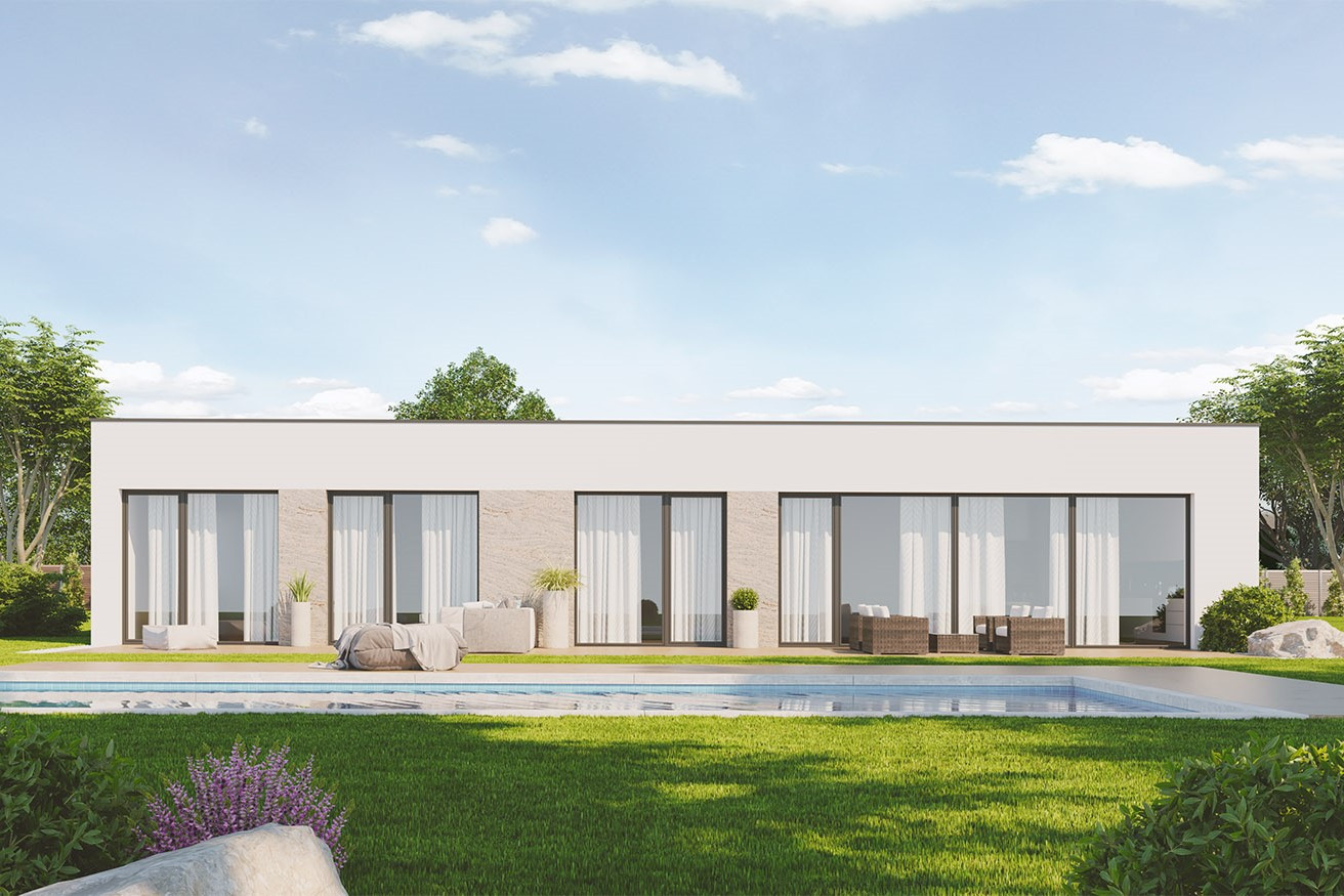 Bungalov s dispozicí ve tvaru písmene L se řadí mezi nejoblíbenější typy rodinných domů u nás. Oddělená denní a noční zóna s vlastním zázemím zajišťují pohodlný provoz domácnosti. K výhodám patří i rohová terasa a integrovaná garáž propojená se zádveřím.