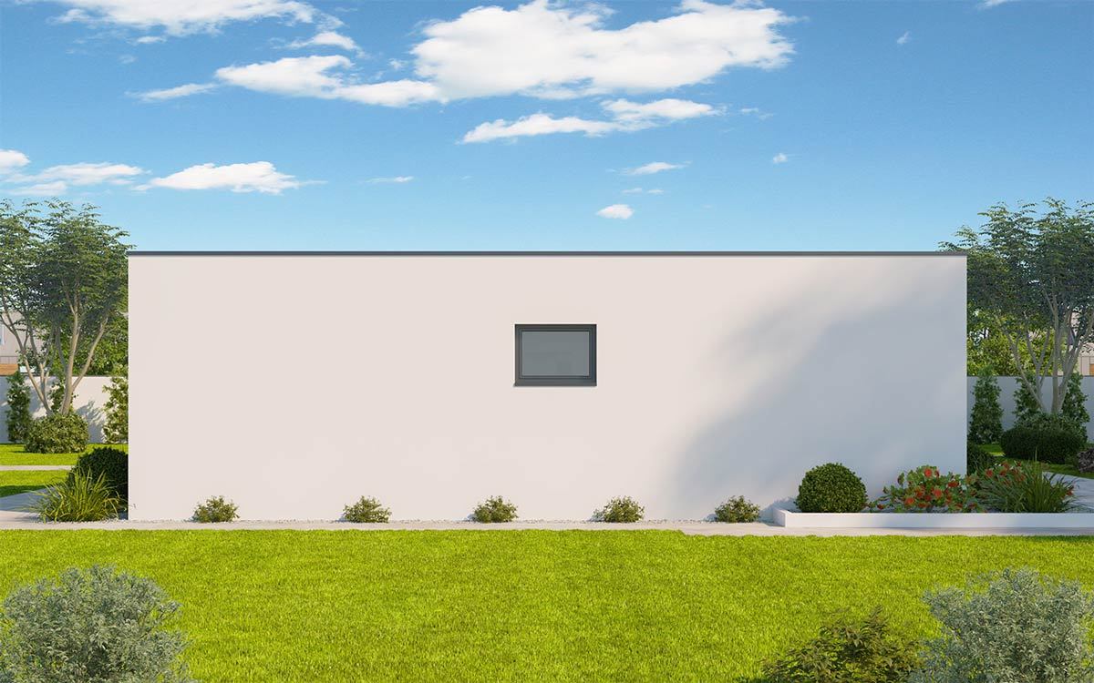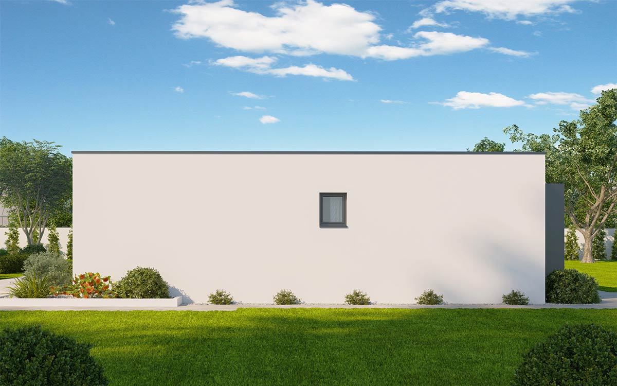 Moderní úsporný dům nabízí praktické bydlení za přijatelnou cenu. Centrem je obývací pokoj s kuchyní a prosklenou stěnou do zahrady. Rozděluje dispozici na dvě části – apartmá rodičů a zónu s dětskými pokoji a hlavním vstupem. Obě zóny mají vlastní zázemí a navzájem se neruší.
