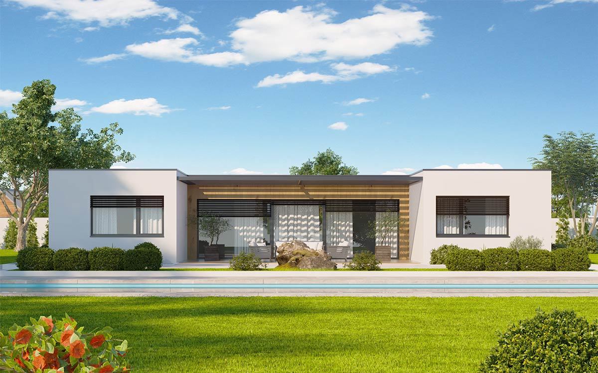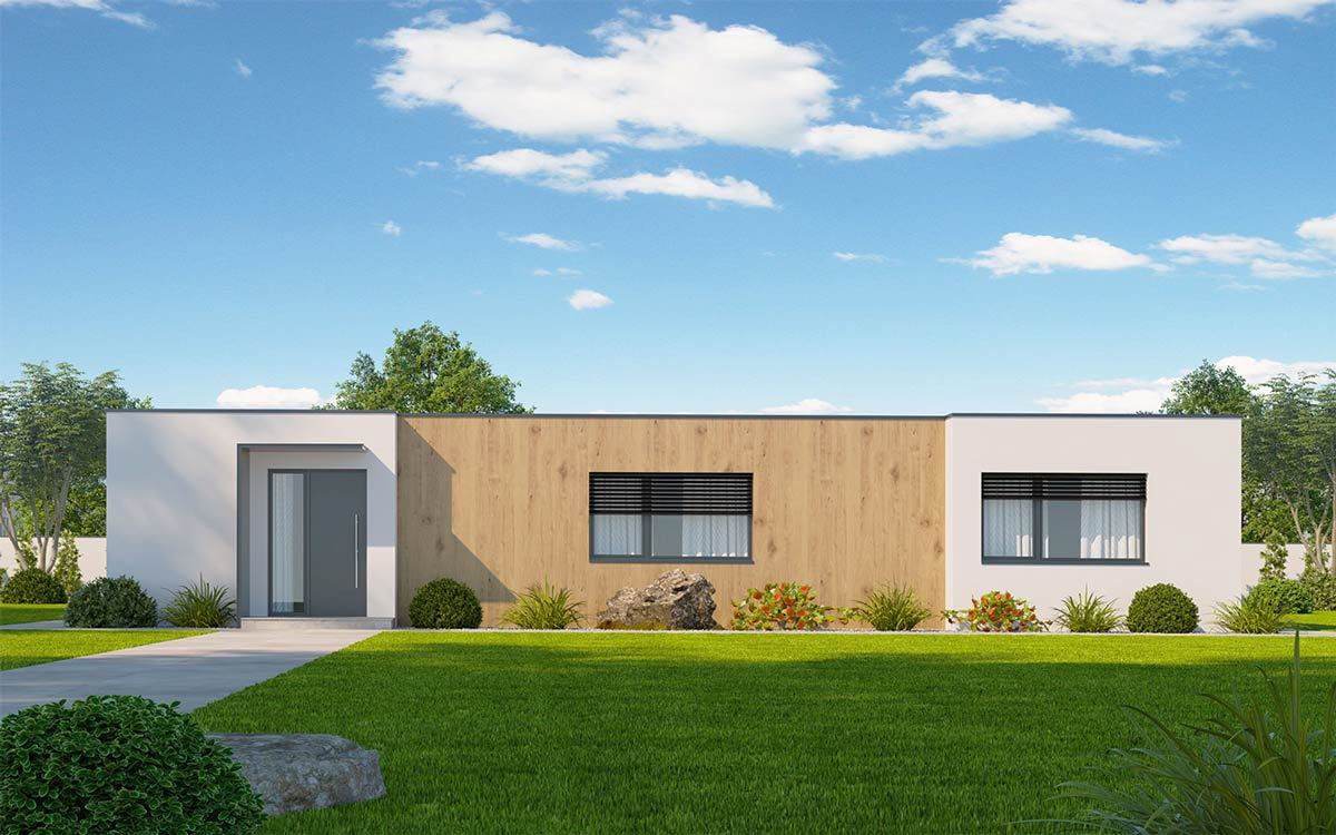 Jednopodlažní dům o dispozici 3 + kk + g je vhodným řešením pro rodiny uvažující o jednom dítěti či jako řešení bydlení na stáří. Dům má půdorys tvaru L, kdy je dispozičně dělen na společenskou a klidovou zónu.