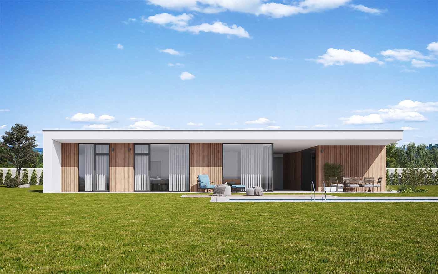 Středem domu je prostorný obývací pokoj zahrnující také kuchyňskou linkou s ostrůvkem. Díky celoprosklené stěně orientované do zahrady je obývací pokoj vizuálně propojen s venkovní terasou. Umístění dětských pokojů a ložnice symetricky na opačných stranách obývacího pokoje poskytuje soukromí všem členů rodiny. Ložnice má vlastní koupelnu přístupnou z šatny. Plochá střecha v kombinaci s dřevěným stíněním terasy propůjčuje domu moderní vzhled. Vzdušně navržené obytné místnosti a velké prosklené plochy zajišťují, že se v tomto domě budete vždy cítit skvěle.