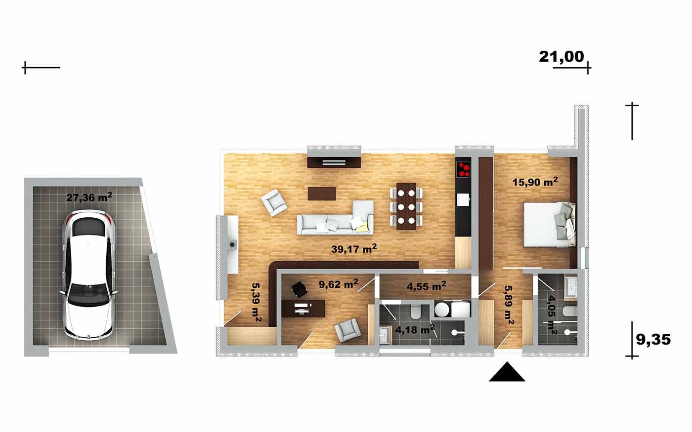 Moderní úsporný dům nabízí praktické bydlení za přijatelnou cenu. Centrem je obývací pokoj s kuchyní a prosklenou stěnou do zahrady. Rozděluje dispozici na dvě části – apartmá rodičů a zónu s dětskými pokoji a hlavním vstupem. Obě zóny mají vlastní zázemí a navzájem se neruší.