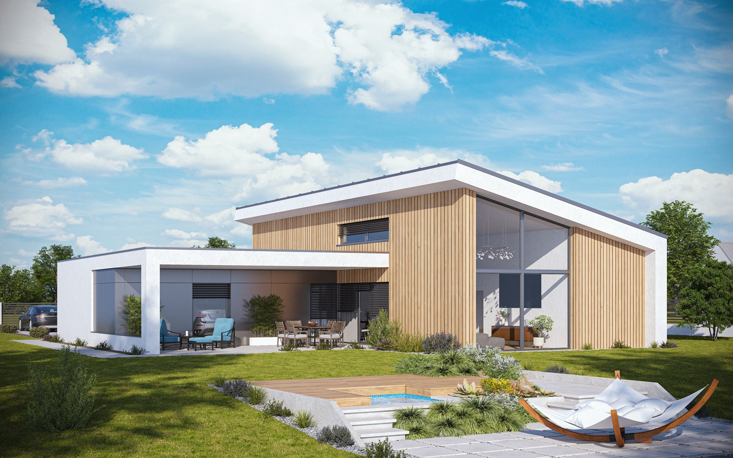 Moderní bydlení vhodné do městské zástavby vyniká kombinací ploché a pultové střechy s výrazným orámováním. Překvapí vás svou prostorností, nadčasovostí a originalitou.