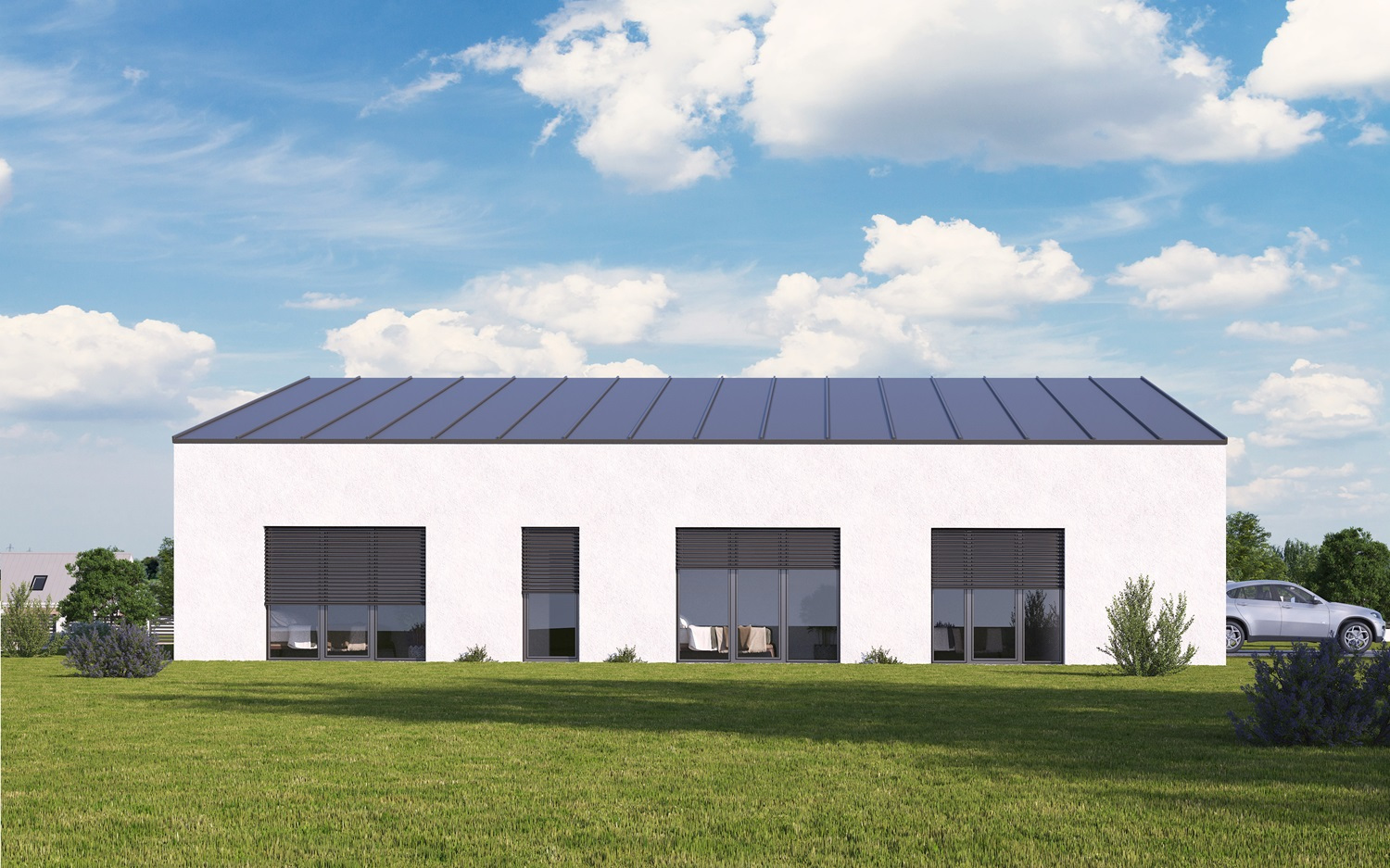 Originální moderní bungalov je vhodný především do nové zástavby a poskytne nadstandardní komfort čtyřčlenné rodině. Architektura zaujme velkým prosklením, zaoblenými nárožími a velkorysým společným obývacím prostorem. Interiér se maximálně propojuje se zahradou, z každého pokoje se dá vyjít přímo ven.
