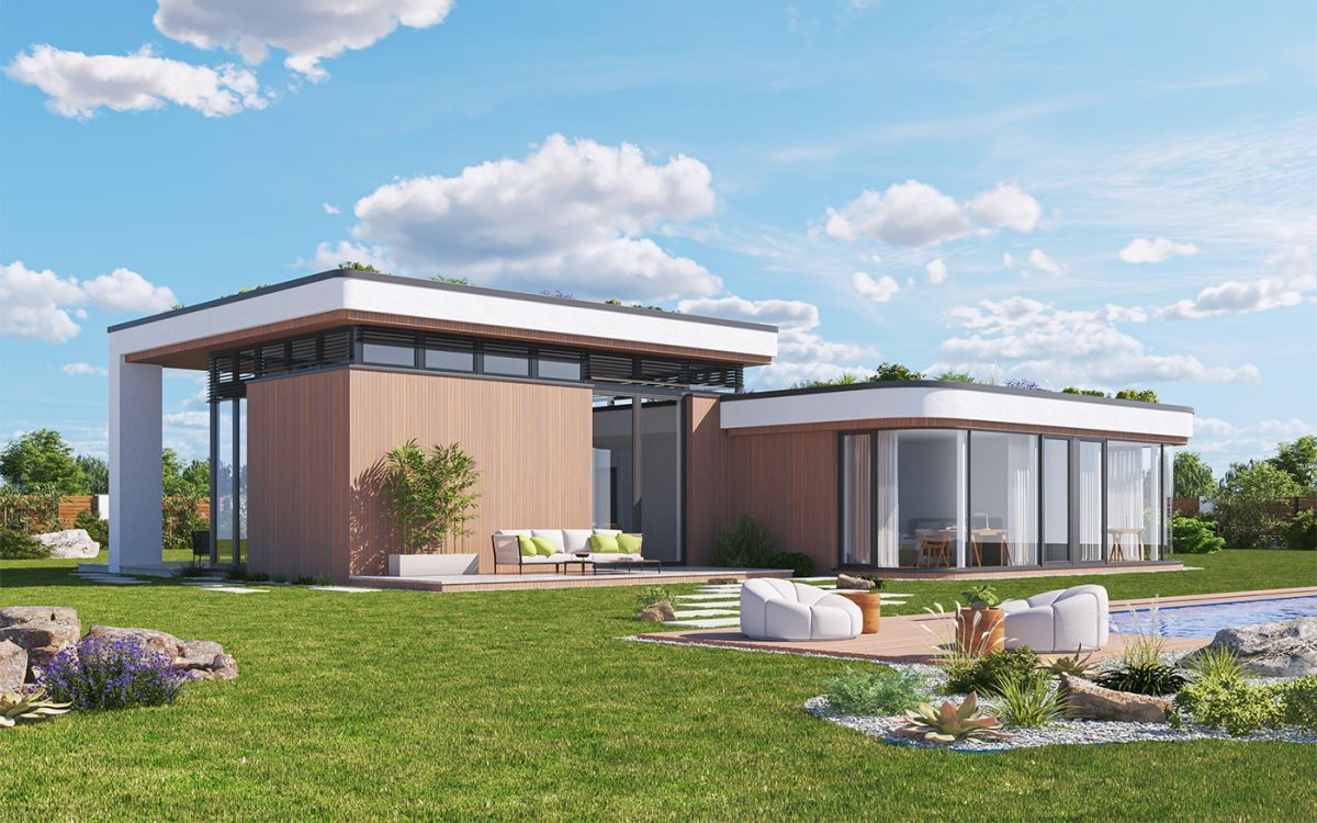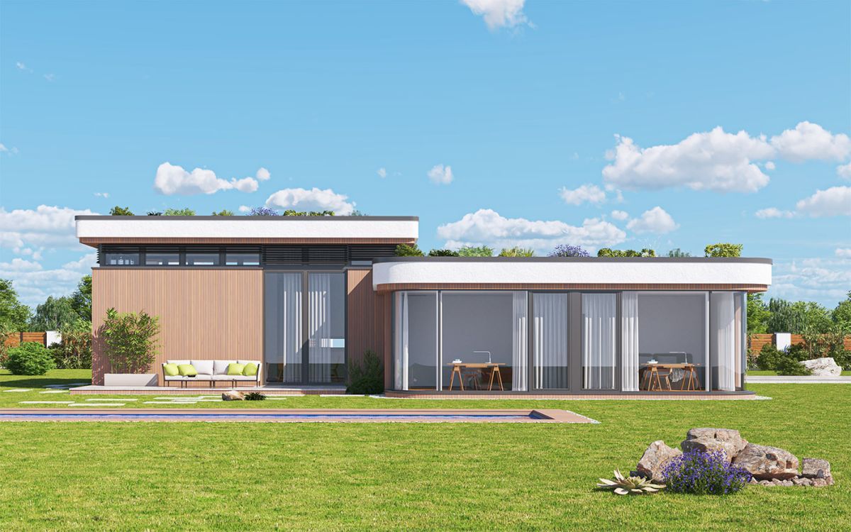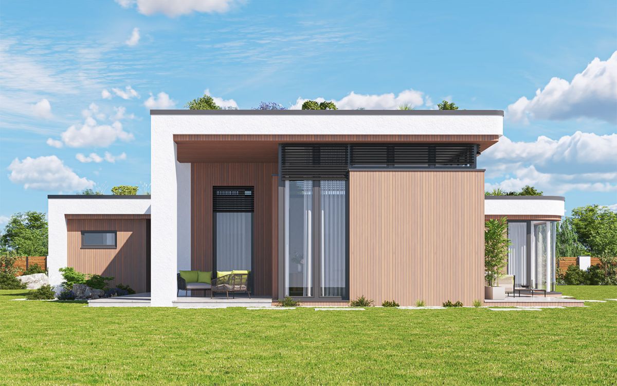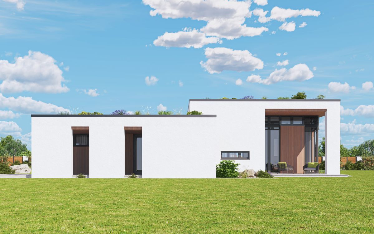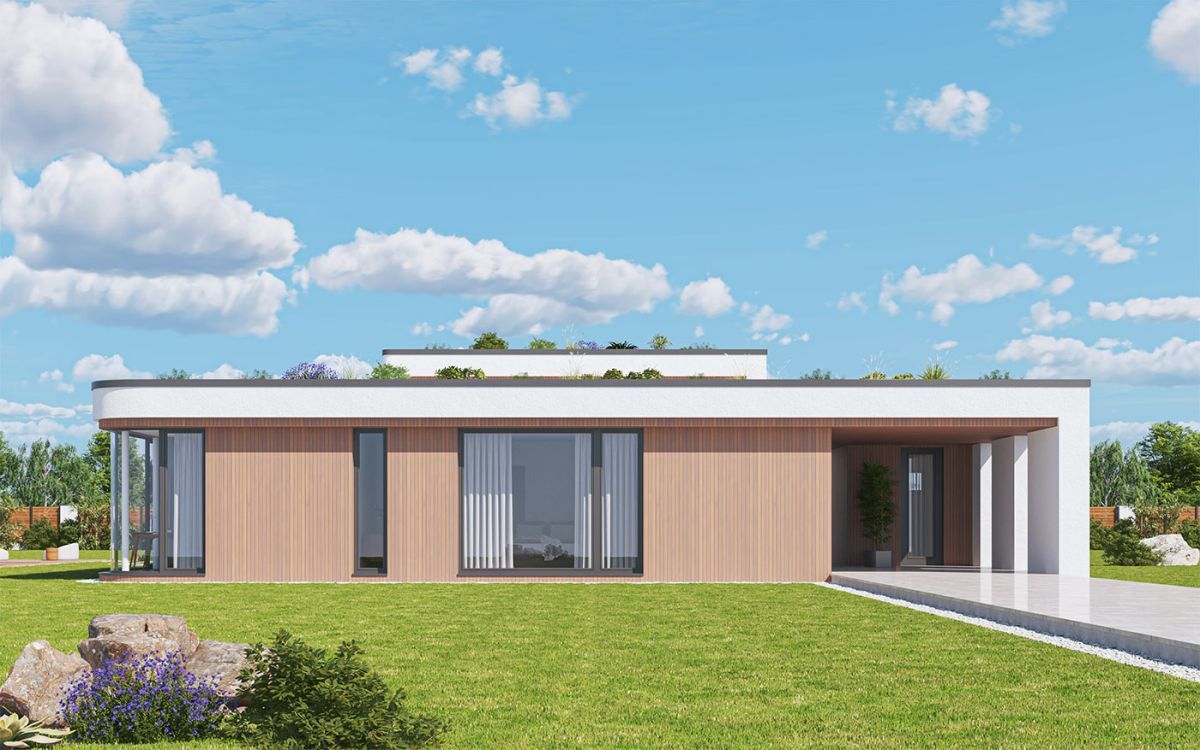 Originální moderní bungalov je vhodný především do nové zástavby a poskytne nadstandardní komfort čtyřčlenné rodině. Architektura zaujme... velkým prosklením, zaoblenými nárožími a velkorysým společným obývacím prostorem. Interiér se maximálně propojuje se zahradou, z každého pokoje se dá vyjít přímo ven.