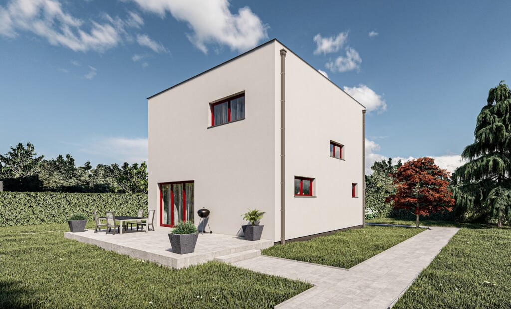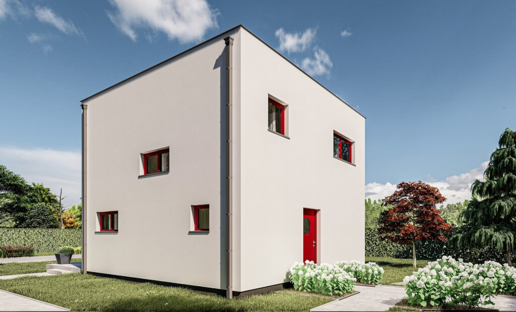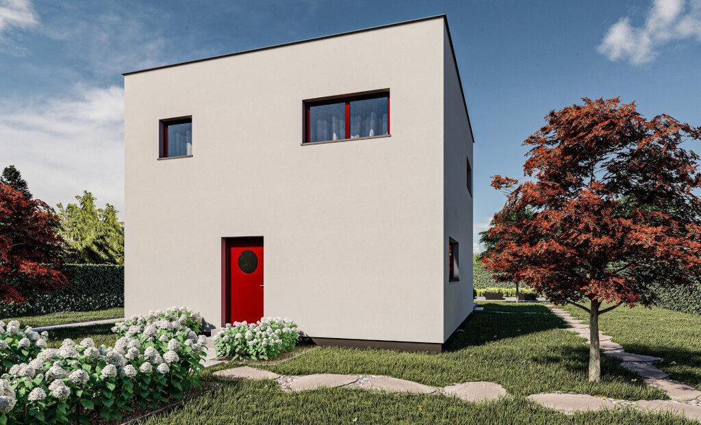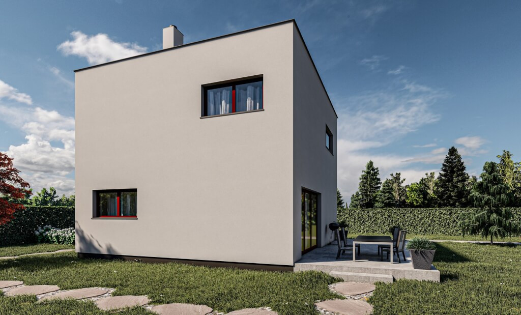 Moderní kompaktní architektura s pultovou střechou bude výrazná v městské i venkovské zástavbě, kde dům vynikne svou výškou. Postačí mu malý pozemek. Na velmi malé zastavěné ploše nabízí praktické a úsporné bydlení pro čtyřčlennou rodinu, pokoje v patře nejsou zmenšeny šikmými stropy jako v běžné podkroví. Ke schodišti je třeba projít přes celý obývací pokoj.