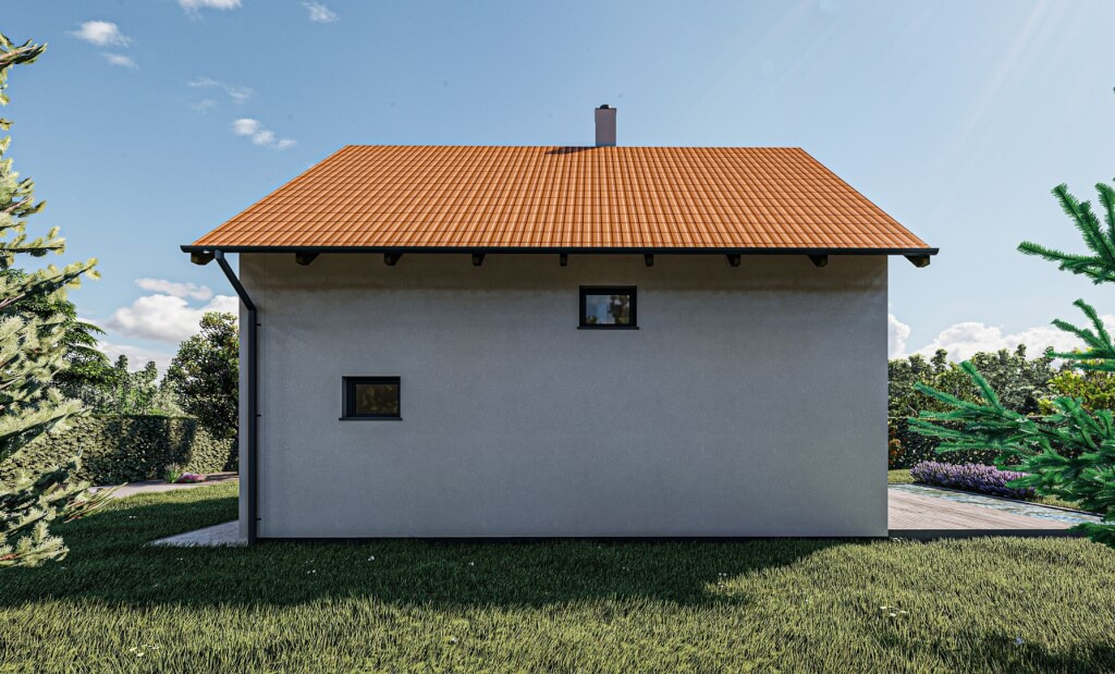 Jednoduchý dům vhodný na venkov i do města, postačí malý pozemek. Poskytne praktické bydlení s nízkými provozními náklady. Má přehlednou dispozici, příjemný obývací pokoj a komfortní technickou místnost. Pro pětičlennou rodinu je výhodné rozdělení na ložnici rodičů v přízemí a dětské pokoje v podkroví, bylo by potřeba více úložného prostoru