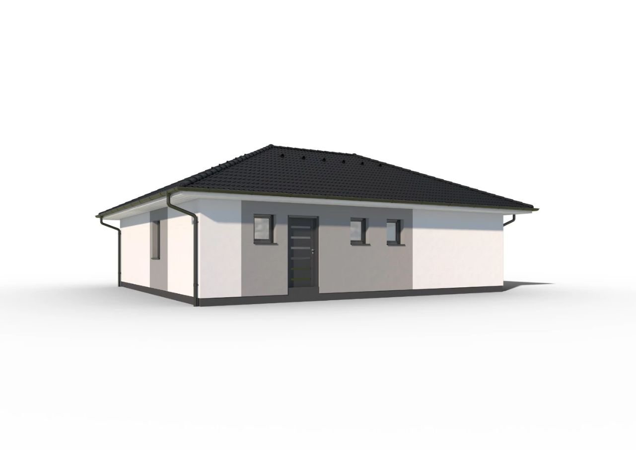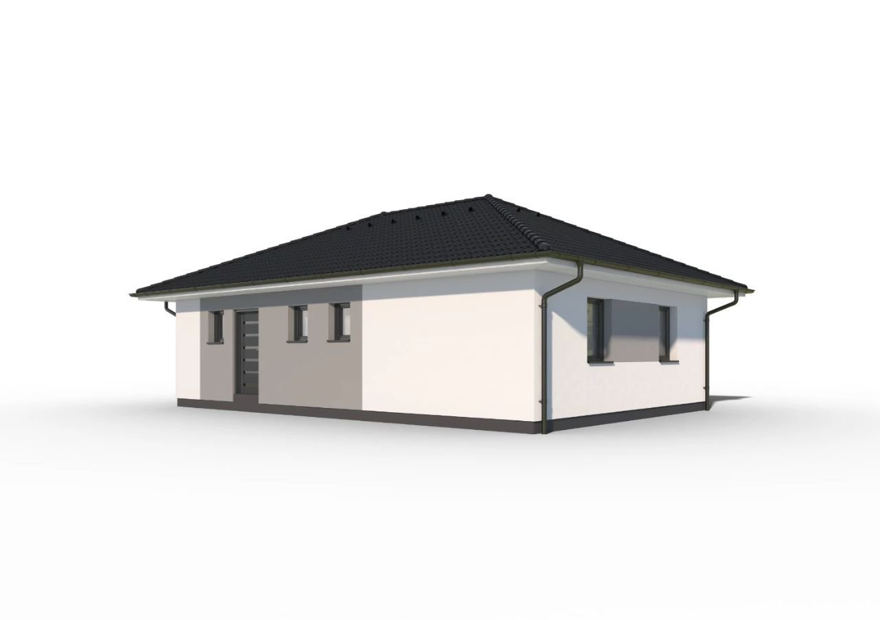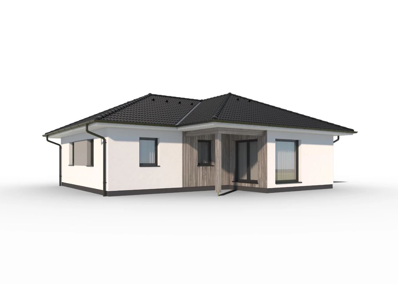 Jednoduchý moderní dům bude dobře vypadat v nové i starší zástavbě. Vyžaduje delší obdélníkový nebo velký čtvercový pozemek. Poskytne pohodlné bezbariérové rodinné bydlení, má velký společný obývací prostor, průchozí do ložnicové části. Z každého pokoje se dá vyjít přímo na zahradu. Výhodou je i úsporný provoz.