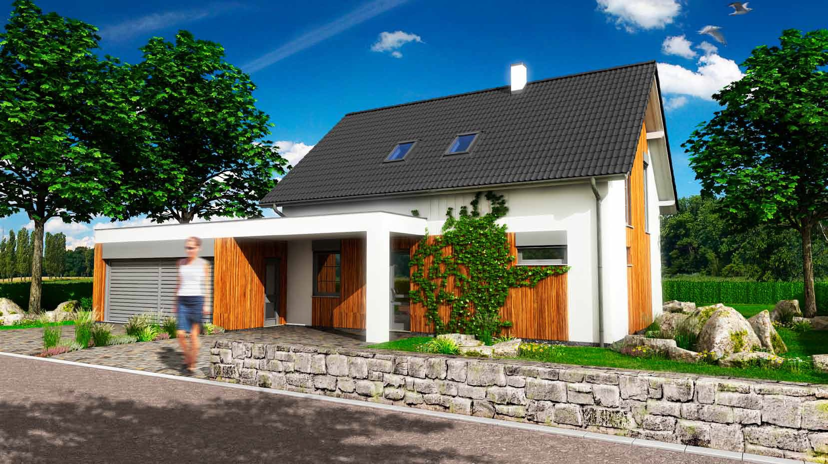 Moderní kompaktní architektura s pultovou střechou bude výrazná v městské i venkovské zástavbě, kde dům vynikne svou výškou. Postačí mu malý pozemek. Na velmi malé zastavěné ploše nabízí praktické a úsporné bydlení pro čtyřčlennou rodinu, pokoje v patře nejsou zmenšeny šikmými stropy jako v běžné podkroví. Ke schodišti je třeba projít přes celý obývací pokoj.