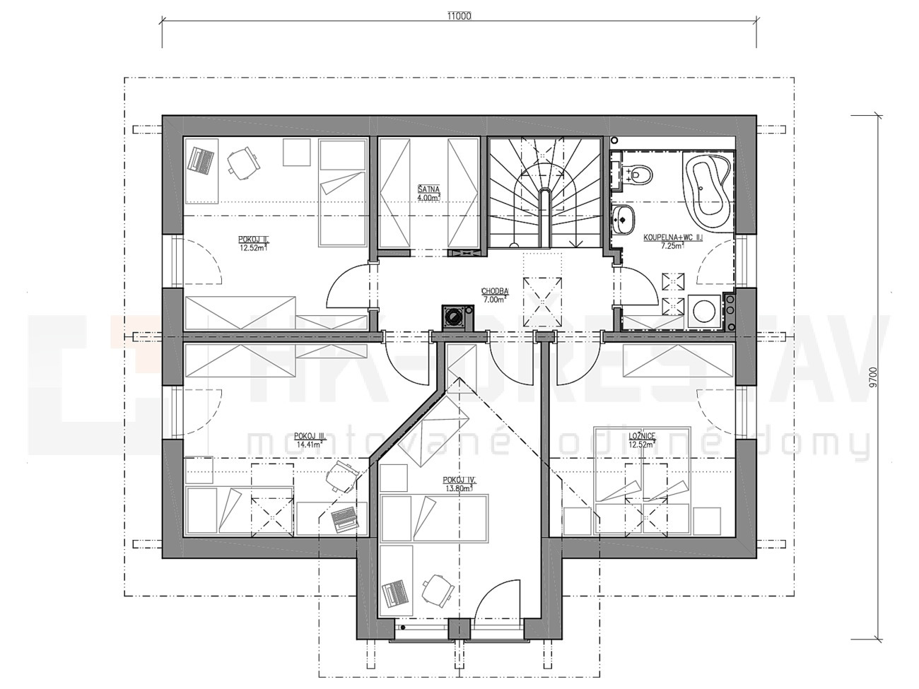 Dům nabízí komfortní bydlení čtyřčlenné rodině s odpovídajícím zázemím. Upoutá pozornost díky velkému společnému obývacímu prostoru, který je zajímavě rozdělen centrálním schodištěm. Prostorné jsou také místnosti v patře, které mají vyšší stropy než standardní podkroví. K nadstandardu v kategorii typových projektů lze započítat i kryté garážové stání propojené se vstupem do domu a krytou terasu.