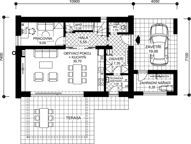 Najdete tu vše, co by v domě pro pětičlennou rodinu mělo být – v přízemí je společná obývací část propojená se zahradou, v podkroví tři dětské pokoje a ložnice rodičů. Všude dostatek úložného prostoru, výhodou je garáž propojená se zádveřím a také domácí pracovna.