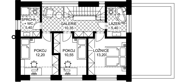 Velkoryse řešený dvoupodlažní dům, který nabídne krásný prostor pro celou rodinu. Svým půdorysným tvarem připomíná písmeno L. Tím je dosaženo utvoření klidného prostoru pro terasu. Velká okna obytných místností a pracovny v 1. NP mohou být orientována na tuto klidnou terasu. Podkroví pak nabídne prostor pro dva velké dětské pokoje, koupelnu, oddělené WC a ložnici se samostatnou koupelnou a šatnou.