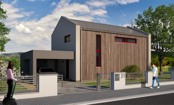 Jednoduchá architektura zapadne do jakékoliv zástavby. Předpokládá se orientace hlavního hřebene domu ve směru severozápad–jihovýchod. Dům poskytne pohodlné a praktické bydlení čtyř- až pětičlenné rodině, s nízkými provozními náklady. Má účelně využitou dispozici, lze přistavět garáž s pultovou střechou nebo přístřešek pro auto.