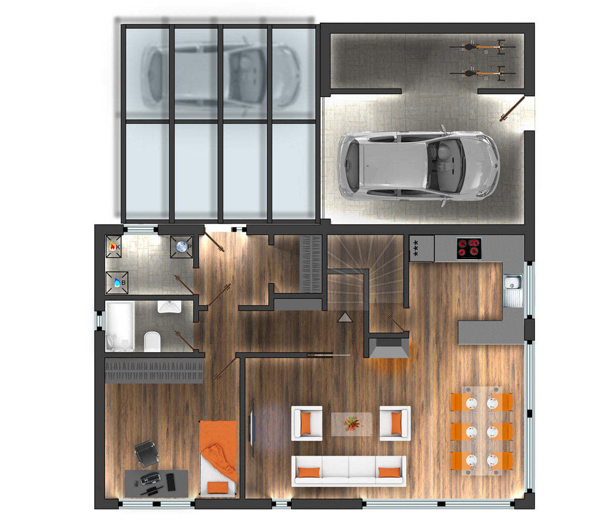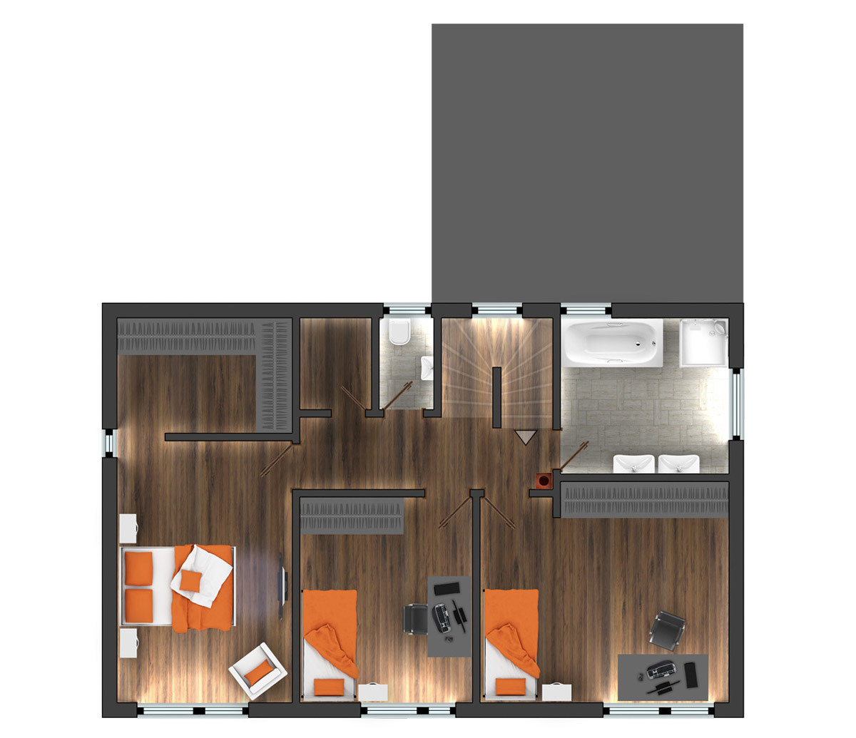 Dům nabídne pohodlné bydlení až pětičlenné rodině. Oblíbený bude jistě společný obývací prostor ve tvaru L s velkou kuchyní. V podkoroví se nacházejí prostorné dětské pokoje, nadstandardně velká ložnice rodičů a studio, vhodné jako další ložnice nebo pro práci z domova. Výhodou je také integrovaná garáž.