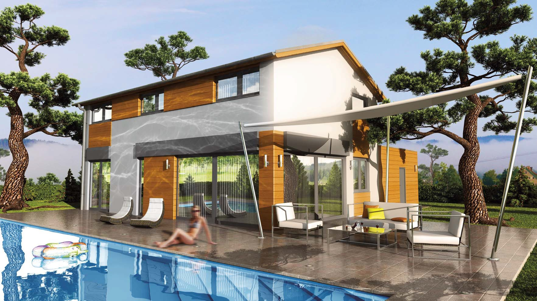 Moderní kompaktní architektura s pultovou střechou bude výrazná v městské i venkovské zástavbě, kde dům vynikne svou výškou. Postačí mu malý pozemek. Na velmi malé zastavěné ploše nabízí praktické a úsporné bydlení pro čtyřčlennou rodinu, pokoje v patře nejsou zmenšeny šikmými stropy jako v běžné podkroví. Ke schodišti je třeba projít přes celý obývací pokoj.