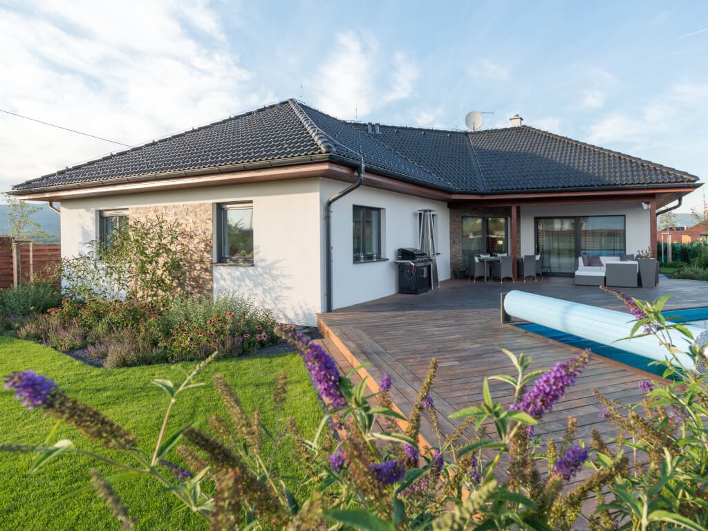 Kombinace sedlové a ploché střechy spojuje tradiční a moderní vzhled a harmonicky zapojuje dům do zástavby na okraji obce. Oblíbená dispozice ve tvaru písmene L je koncipována přehledně a velkoryse – jednu část zaujímá denní zóna, druhou ložnicová část, všechny pokoje mají soukromí a bezbariérový výstup na terasu. Dům poskytuje komfortní zázemí.