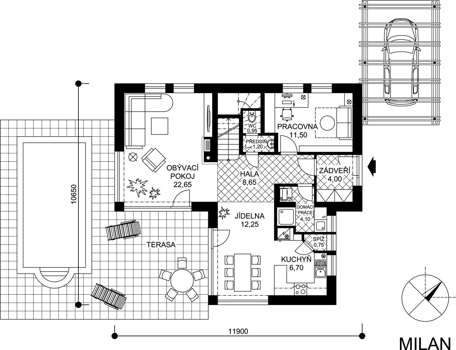 Těžištěm domu je velký společný obývací prostor s komfortní kuchyní a prosklenou stěnou do zahrady. V přízemí je i malá pracovna, ložnice se nacházejí v patře. Dispozice obsahuje pohodlné zázemí i úložné prostory, přitom nezabírá velkou zastavěnou plochu.
