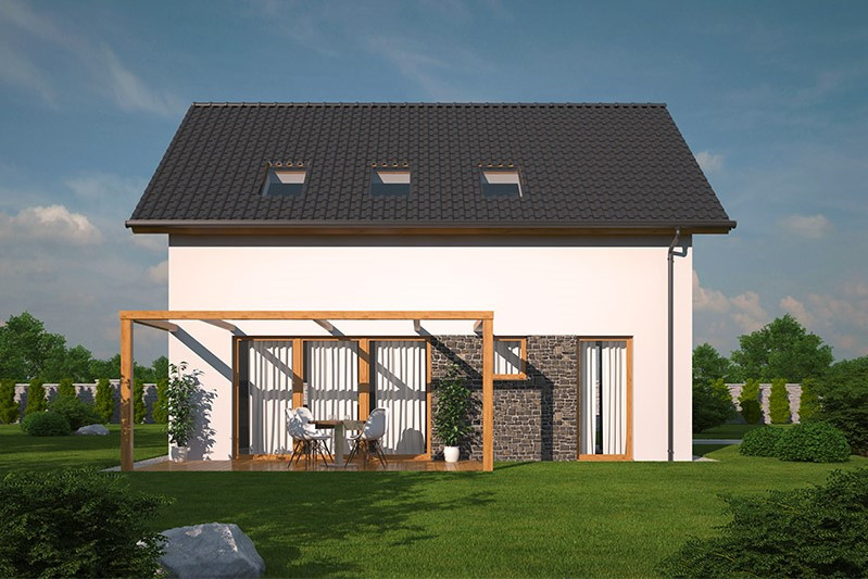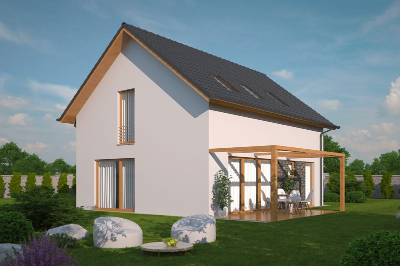 Dům dobře zapadne do města i na venkov a uspokojí nároky na moderní bydlení pro čtyřčlennou rodinu. Velký společný obývací prostor v přízemí je promyšleně rozdělen na kuchyňskou část a sezení, ke kladům patří také chráněná rohová terasa, pohodlné zázemí a dostatek úložného prostoru.