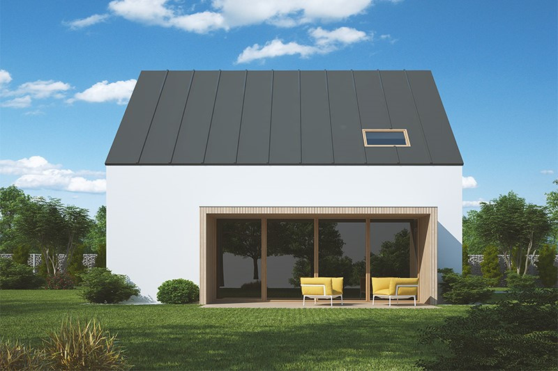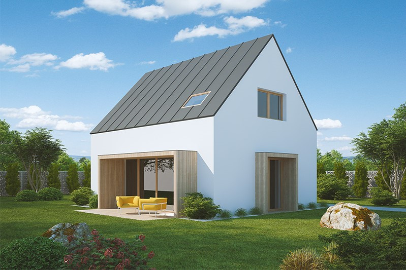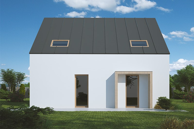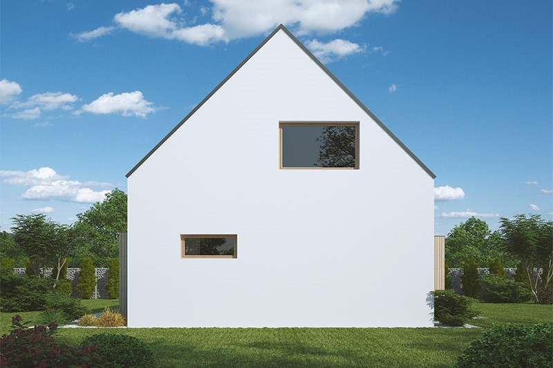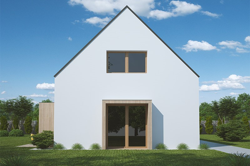Dům dobře zapadne do města i na venkov a uspokojí nároky na moderní bydlení pro čtyřčlennou rodinu. Velký společný obývací prostor v přízemí je promyšleně rozdělen na kuchyňskou část a sezení, ke kladům patří také chráněná rohová terasa, pohodlné zázemí a dostatek úložného prostoru.