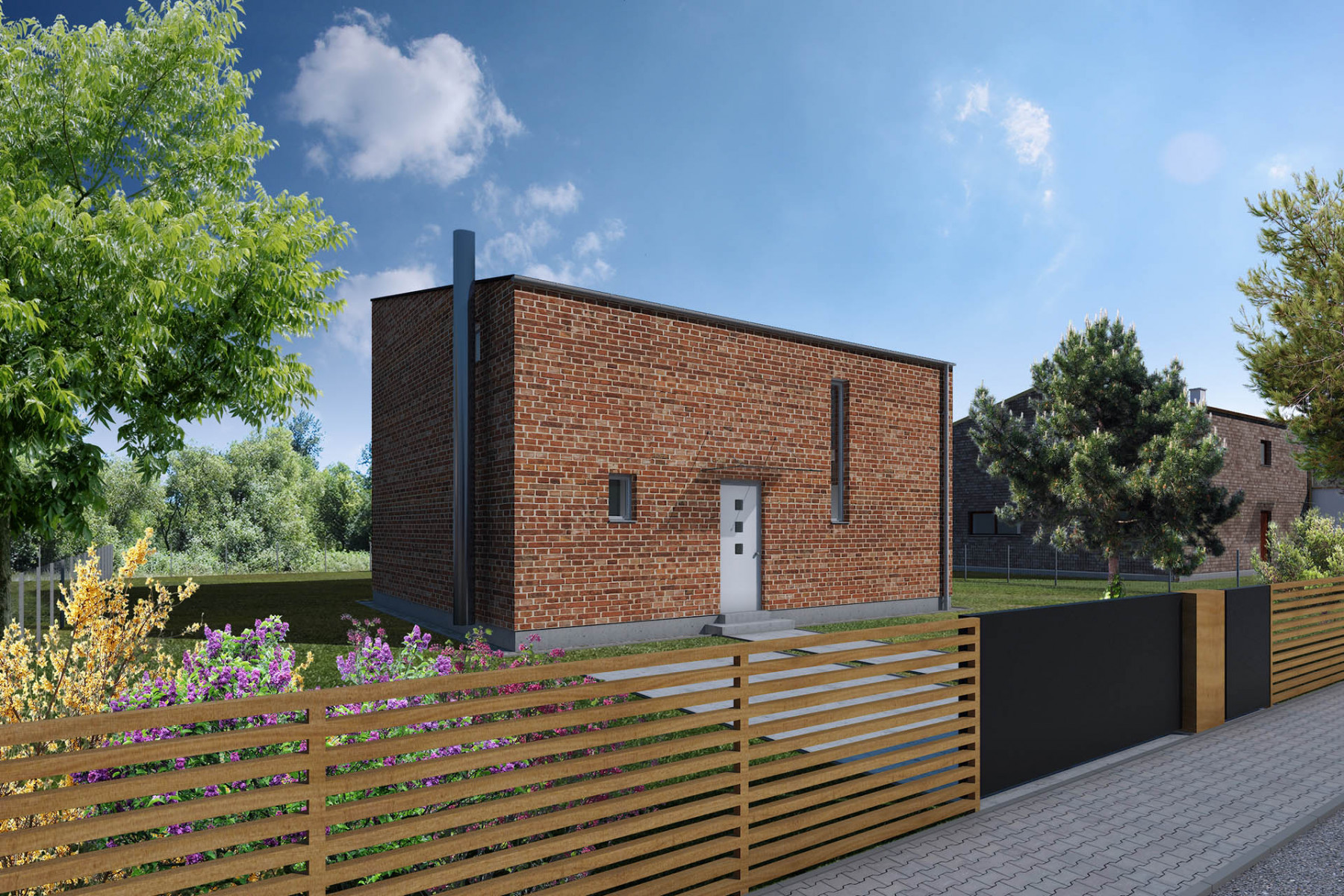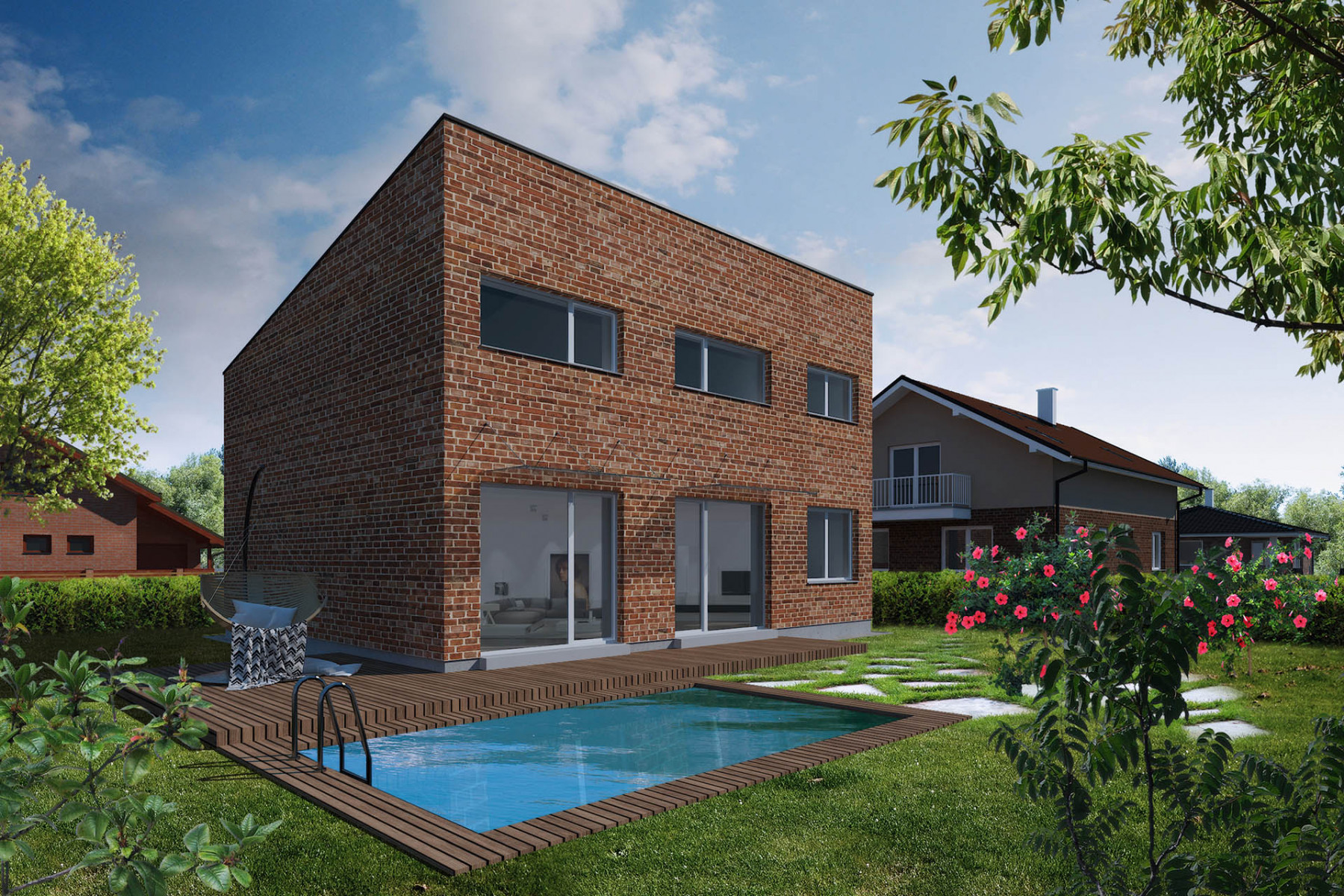 Jedná se o dvoupodlažní dům o dispozici 5 + kk s plochou střechou. Dobře vyřešená dispozice poskytne velkorysý prostor pro rodinné soužití i pro návštěvy a druhé nadzemní podlaží pak poskytuje naprosté soukromí pro každý z pokojů. V druhém nadzemním patře se nacházejí dva pokoje, koupelna a ložnice se svou vlastní koupelnou. Dalším skvělým prvkem je venkovní pergola a kryté parkování pro auta.