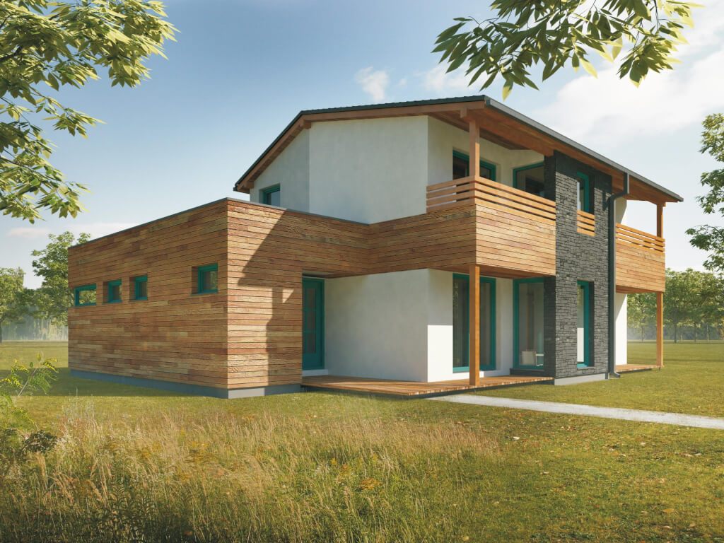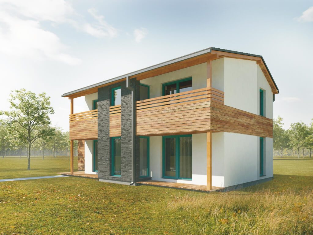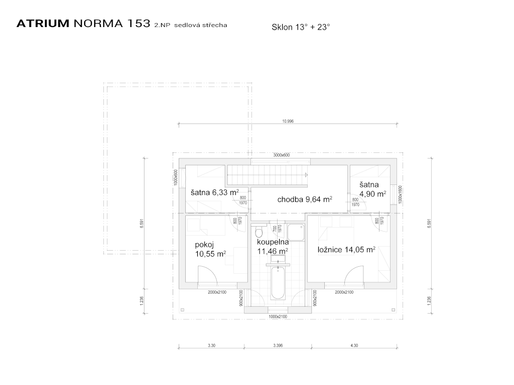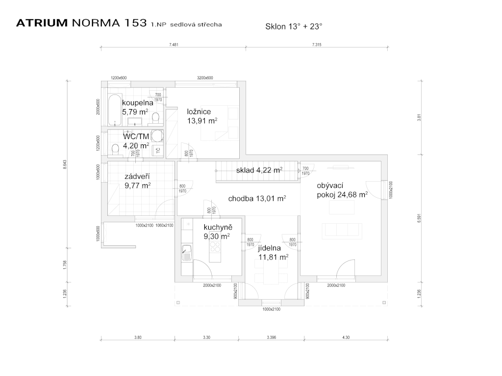 Norma 153 je představitelkou moderní architektury s netradičním vzhledem a vnitřní dispozicí. Přízemí má neobvykle pojatý vstup do obývacího pokoje velkou halou. Halu využijete jako knihovnu a také je zde prostor pro umístění krbových kamen, které znásobí přátelský ráz domu. Z obývacího pokoje se vstupuje posuvnými dveřmi do jídelny a z jídelny dále do kuchyně. Z jídelny i z obývacího pokoje projdete ven do zahrady. Prvnímu patru dominuje elegantní a prostorná koupelna s přístupem na balkón. Z ložnice i dětského pokoje je opět přístup posuvnými dveřmi na balkón, který tak propojuje všechny místnosti.