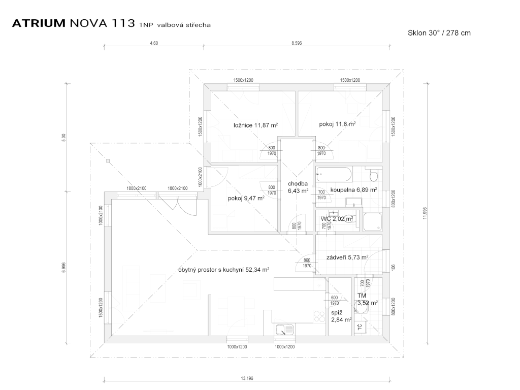 Bungalov Nova 113 se stal prakticky přes noc hitem v kolekci rodinných domů ATRIUM a dnes je jedním z velmi žádaných přízemních domů. Záleží na vás, jestli budete mít společnou kuchyň s obývacím pokojem či oddělenou kuchyň s jídelním stolem. Ke kuchyni patří samozřejmě i spíž, kterou zde také najdete! Tři ložnice jsou určené pro čtyři členy rodiny. Přesah střechy nad terasou u obývacího pokoje je praktický a nedocenitelný nejen v létě, kdy vám rozpálené sluníčko nesvítí přímo do interiéru, ale i v deštivých podzimních dnech. Nova 113 se jistě stane vaším novým domovem.