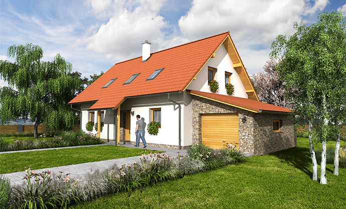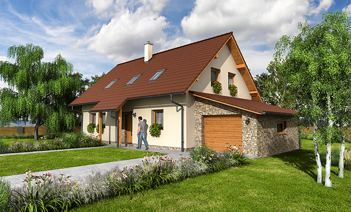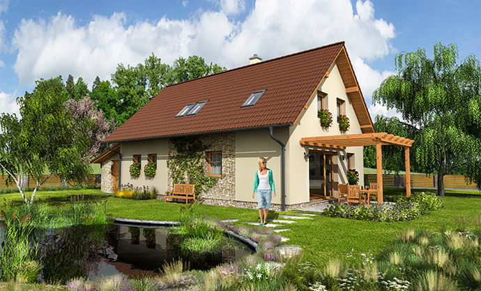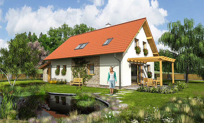 Díky možnosti zvolit různý tvar střechy dům dobře zapadne do městského i venkovského prostředí. Dispozice nabízí nadstandardní komfort pro až pětičlennou rodinu – velké pokoje a pohodlné zázemí včetně potřebného úložného prostoru.