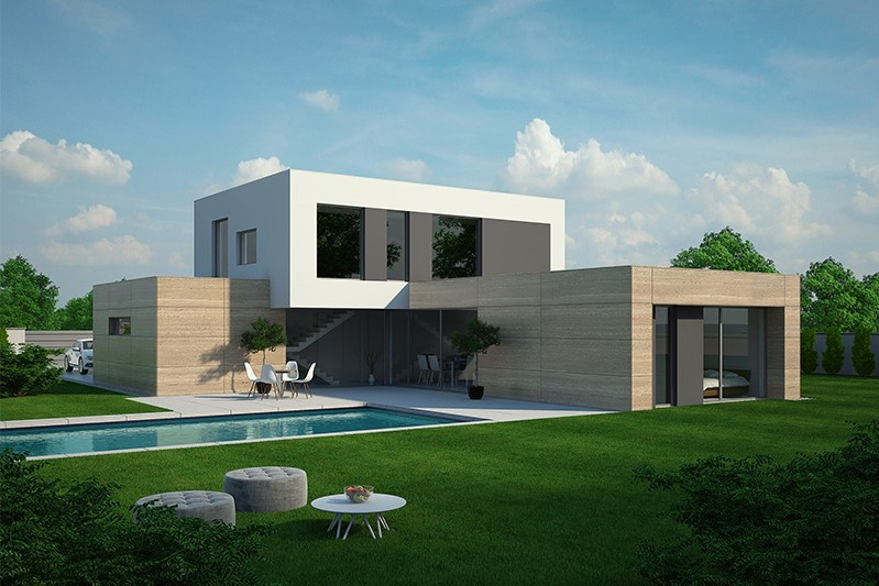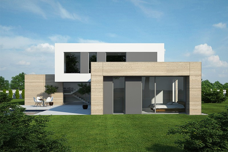 Elegantní architektura je vhodná do moderní městské čtvrti. Pozornost si zaslouží velký společný obývací prostor, velké ložnice a pohodlné zázemí, zastavěná plocha domu přitom není příliš velká. Jako jeden z mála katalogových projektů nabízí celkem čtyři terasy a kryté parkování pro dva automobily (v ceně).