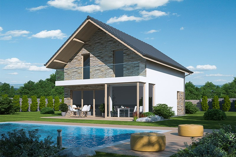 Jednoduchá architektura zapadne do jakékoliv zástavby. Předpokládá se orientace hlavního hřebene domu ve směru severozápad–jihovýchod. Dům poskytne pohodlné a praktické bydlení čtyř- až pětičlenné rodině, s nízkými provozními náklady. Má účelně využitou dispozici, lze přistavět garáž s pultovou střechou nebo přístřešek pro auto.