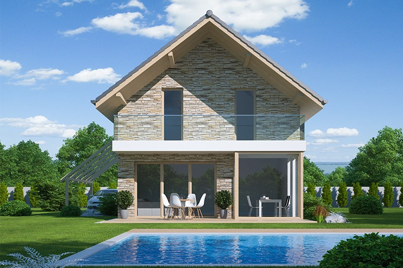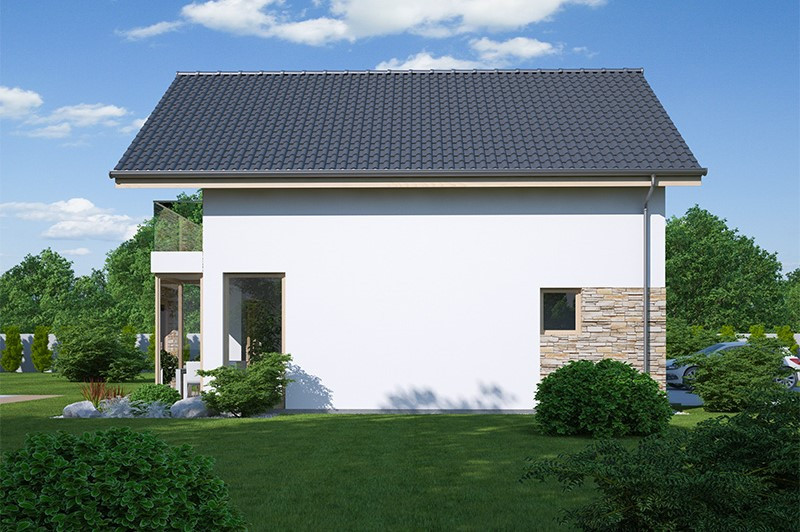 Jednoduchý dům se sedlovou střechou má tradiční tvar a hezký moderní design, bude dobře vypadat na venkově i ve městě. Nabízí prakt... ické bydlení pro čtyřčlennou rodinu. Příjemný je zejména vzdušný obývací pokoj, krytá terasa v přízemí a lodžie v patře. K domu lze přistavět kryté parkovací stání.