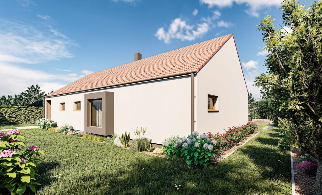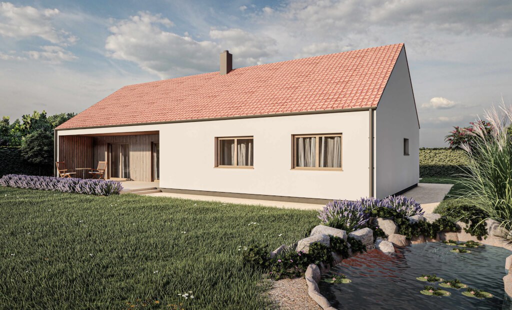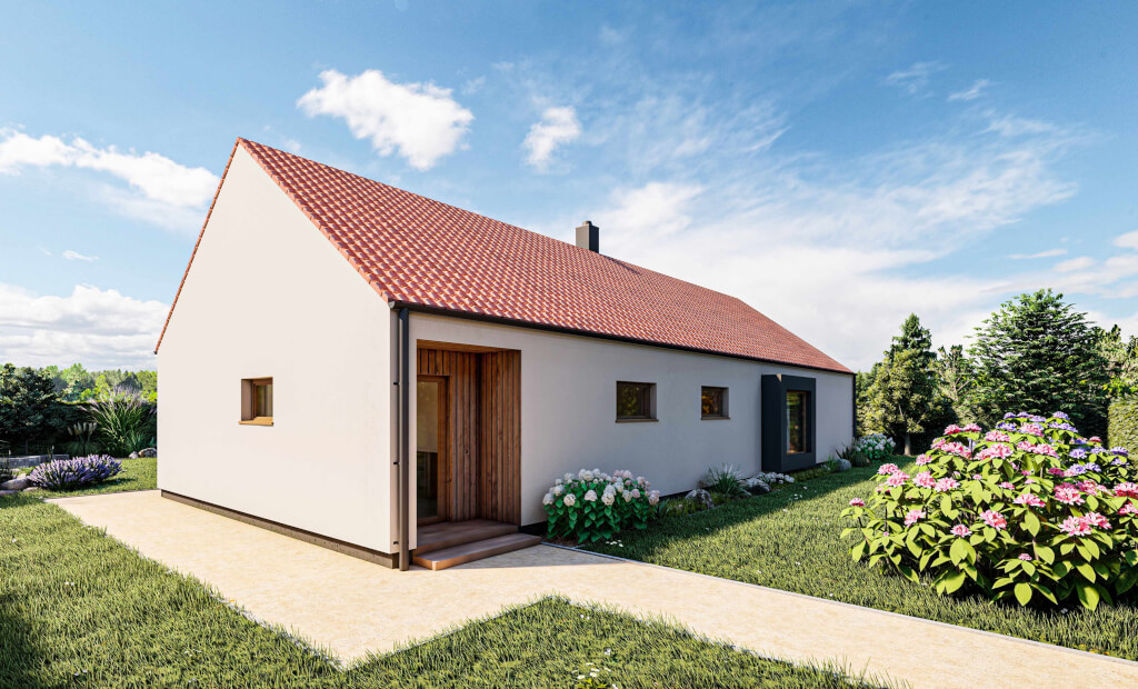 Jednoduchý bezbariérový dům poskytne praktické bydlení za výhodnou cenu a s nízkými provozními náklady. Hodí se do městské i venkovské zástavby, má příjemnou krytou terasu a francouzská okno z pokojů přímo na zahradu. Určitou daní za úspornost je malá koupelna bez vany, navíc spojená s tech. místností.