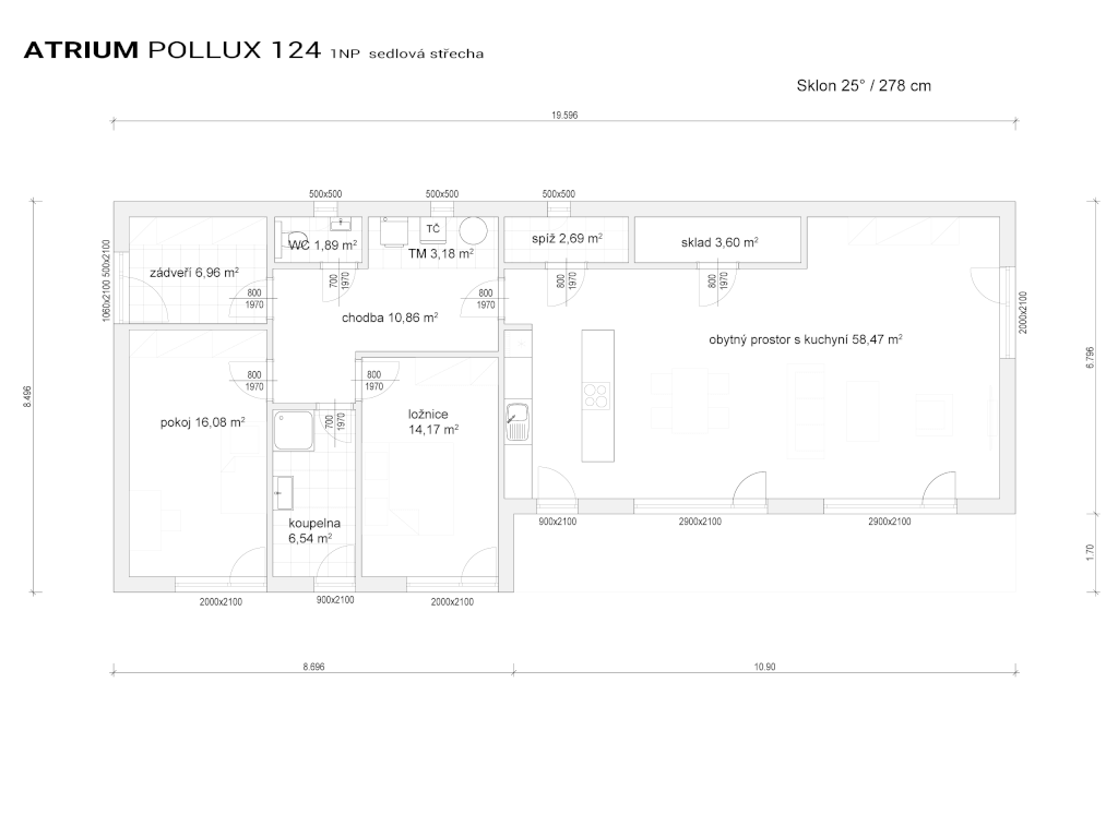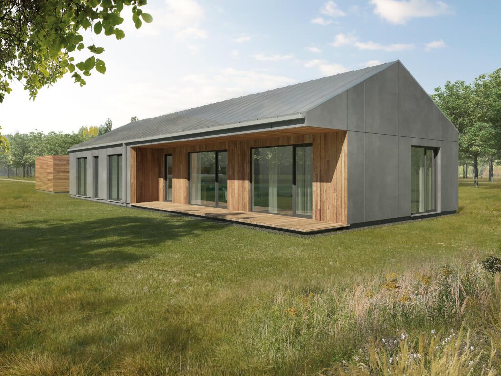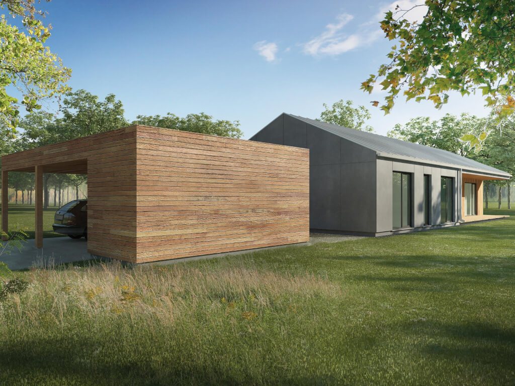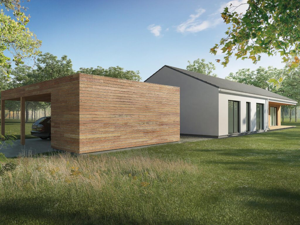 Zajímavý dům například pro starší manžele. Kuchyň s ostrůvkem na varnou desku sousedí s velkorysým obývacím pokojem s velkými prosklenými okny. Majitelé domu mají k dispozici spíž a menší skladový prostor. V domě jsou dvě ložnice, které mají společnou koupelnu a WC. Poutavým architektonickým prvkem je zastřešená terasa u obývacího pokoje, která dotváří příjemný a elegantní vzhled domu.