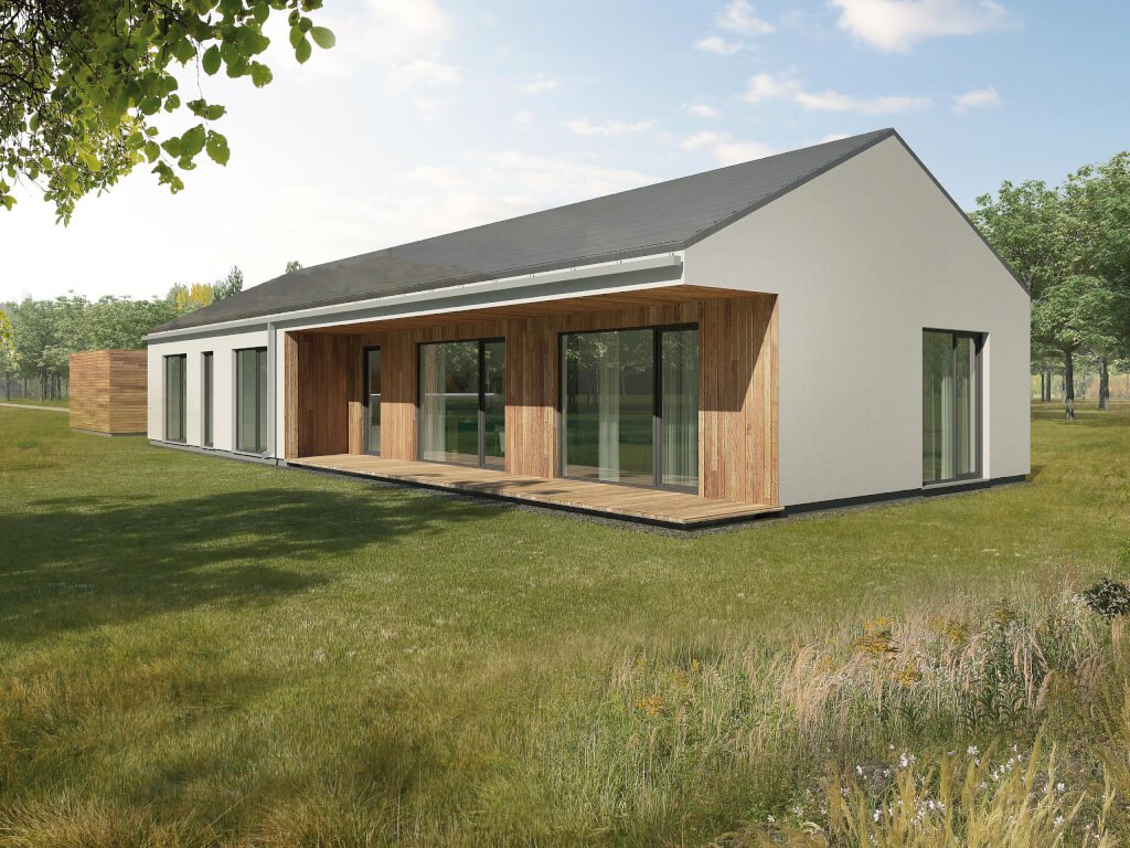 Dům vychází z tradičního tvaru, ale má pohledný moderní design. Poskytne pohodlné bezbariérové bydlení tříčlenné rodině, vyniká zejm... na nadstandardně velkým společným obývacím prostorem s krytou terasou. Nechybí patřičné zázemí včetně úložného prostoru a spíže. Projekt pamatuje i na řešení garáže nebo krytého parkovacího stání.