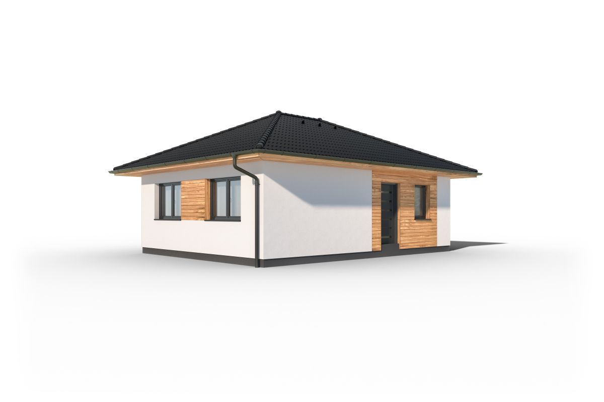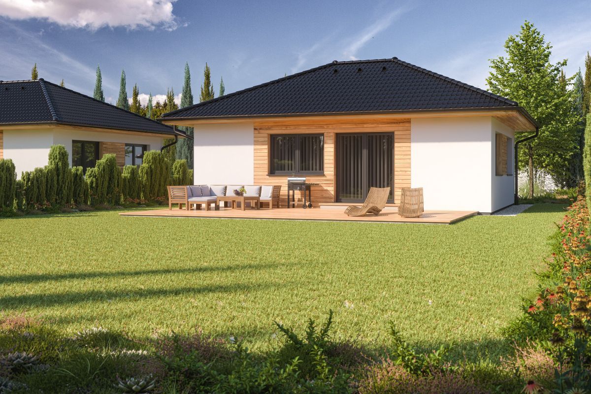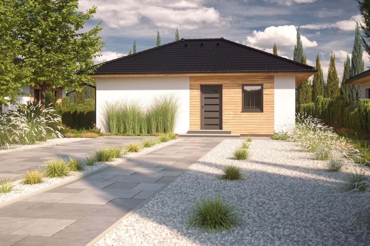 Jednoduchý moderní dům bude dobře vypadat v nové i starší zástavbě. Vyžaduje delší obdélníkový nebo velký čtvercový pozemek. Poskytne pohodlné bezbariérové rodinné bydlení, má velký společný obývací prostor, průchozí do ložnicové části. Z každého pokoje se dá vyjít přímo na zahradu. Výhodou je i úsporný provoz.