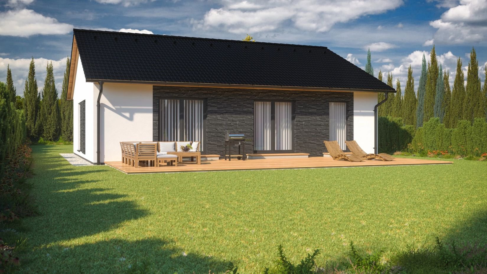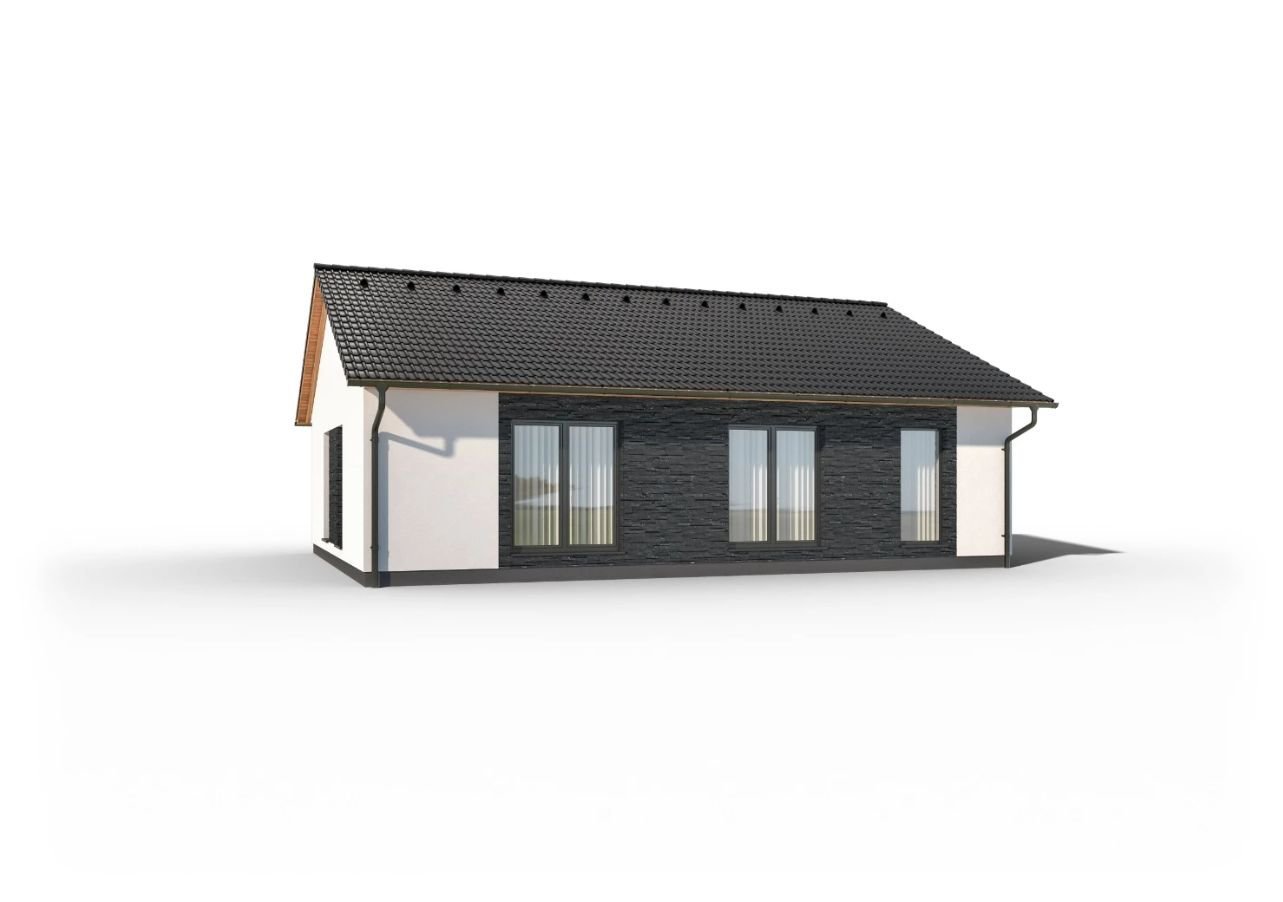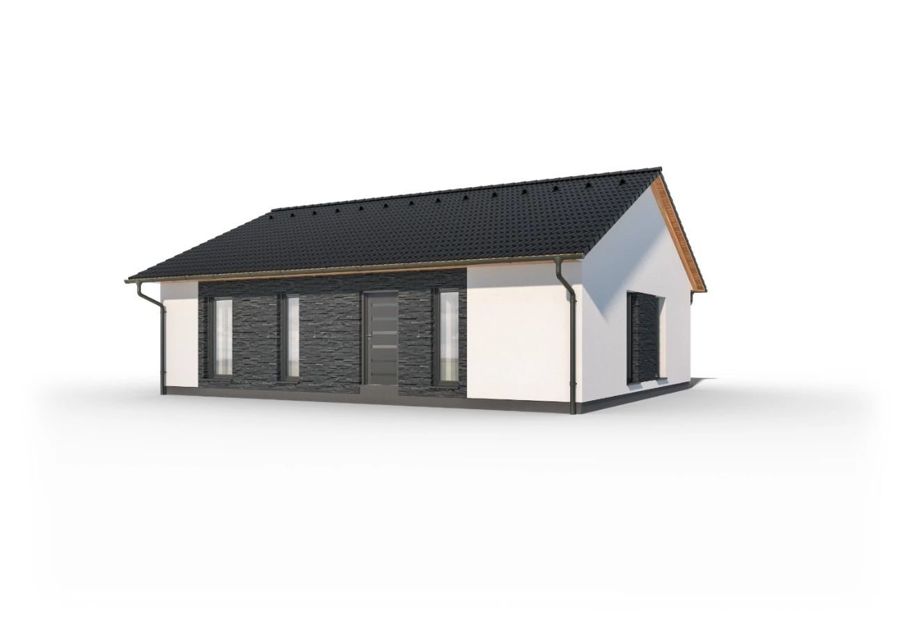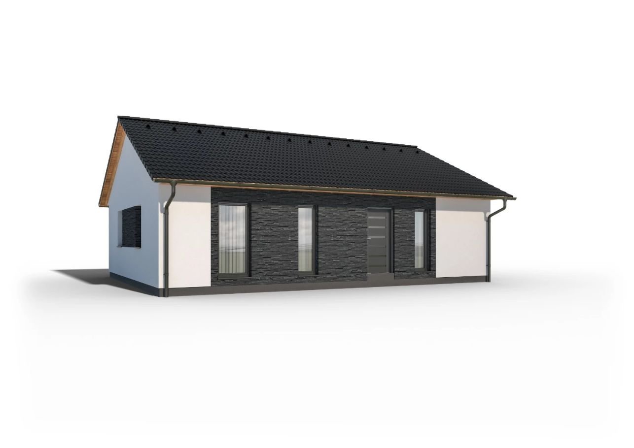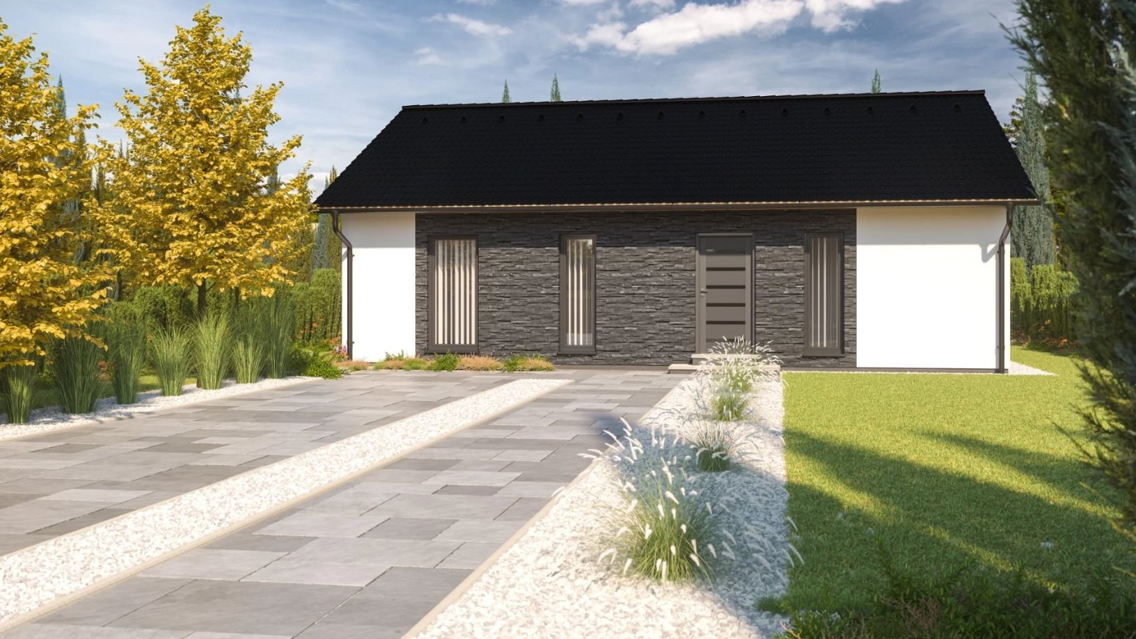 Jednoduchý moderní dům bude dobře vypadat v nové i starší zástavbě. Vyžaduje delší obdélníkový nebo velký čtvercový pozemek. Poskytne pohodlné bezbariérové rodinné bydlení, má velký společný obývací prostor, průchozí do ložnicové části. Z každého pokoje se dá vyjít přímo na zahradu. Výhodou je i úsporný provoz.