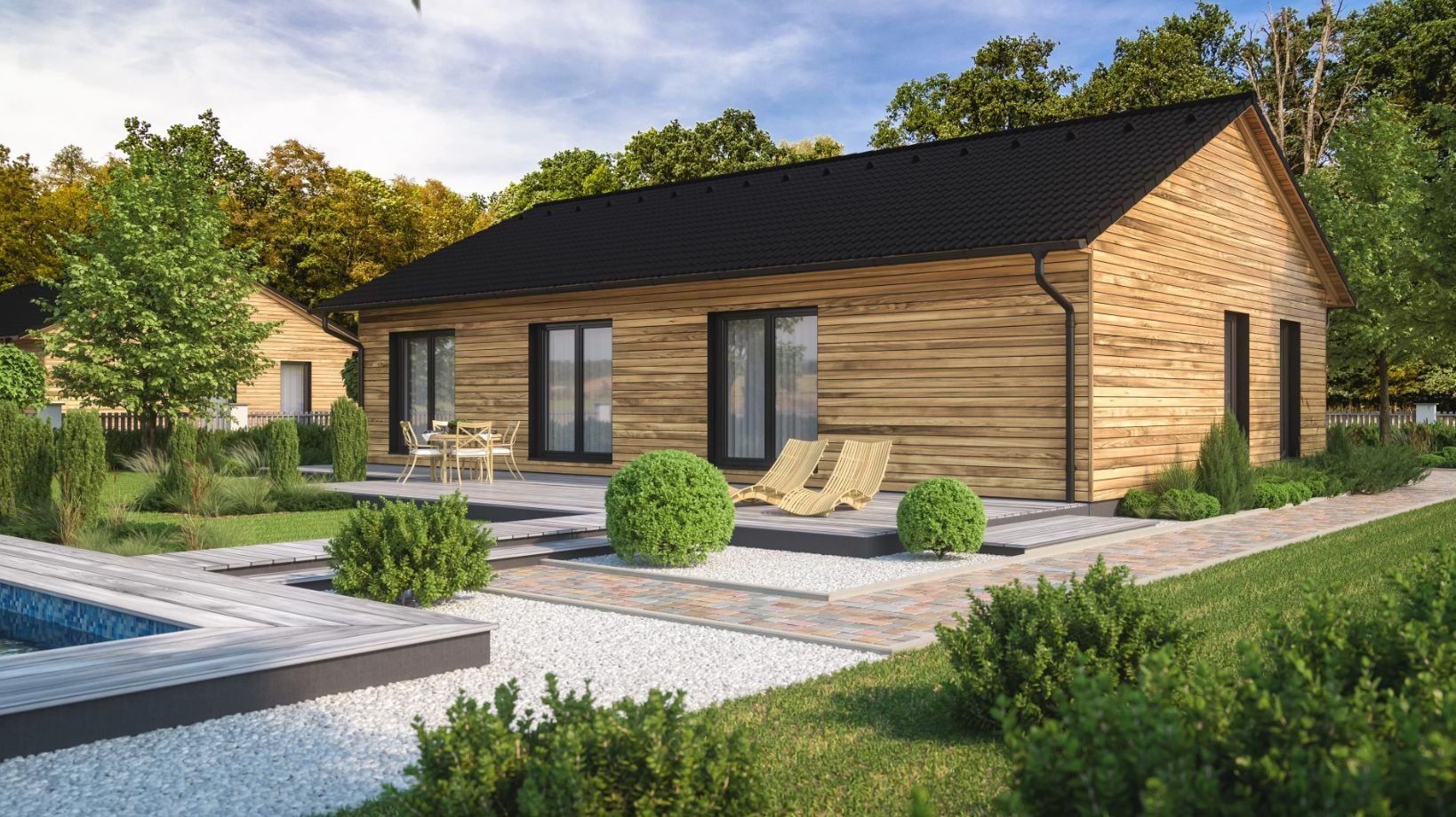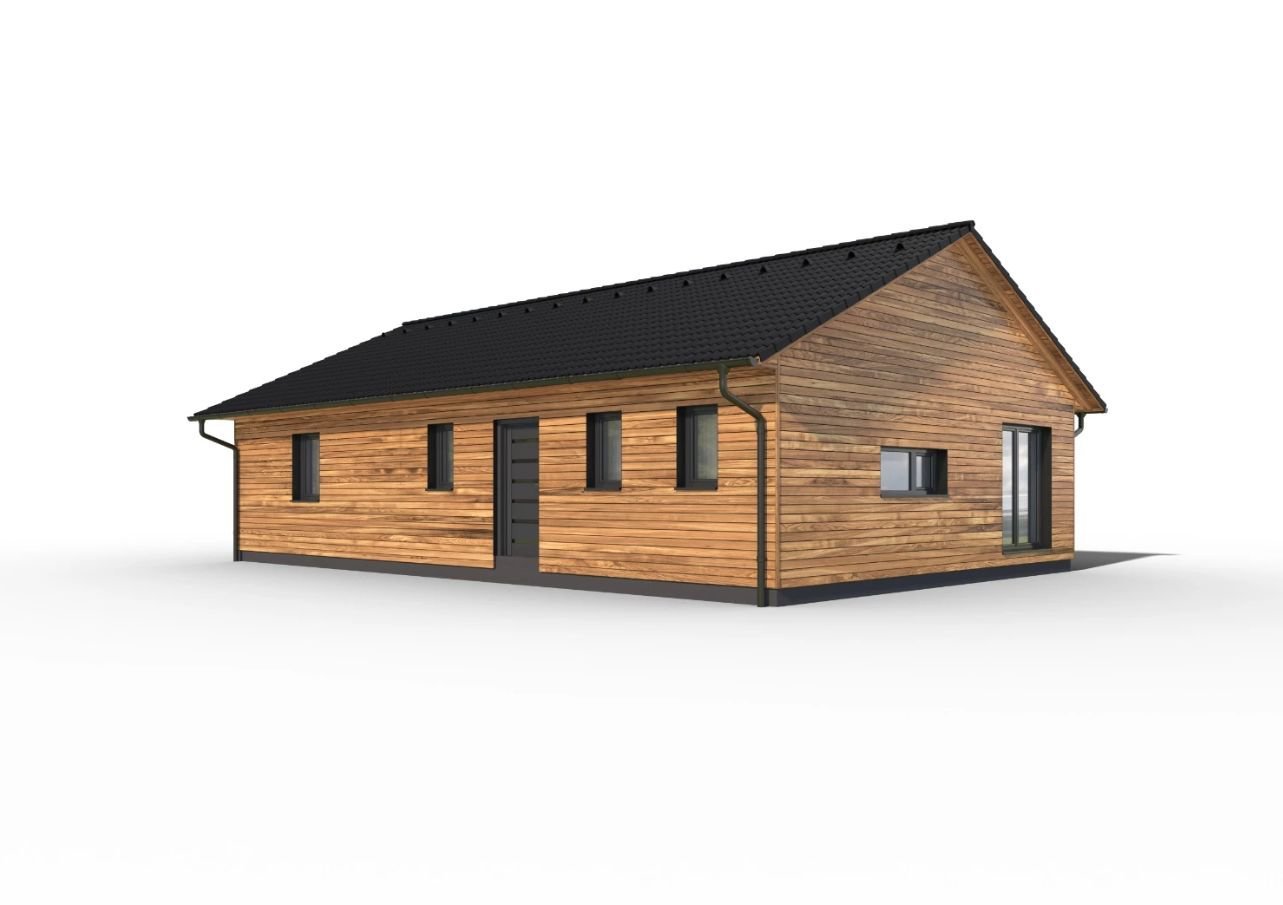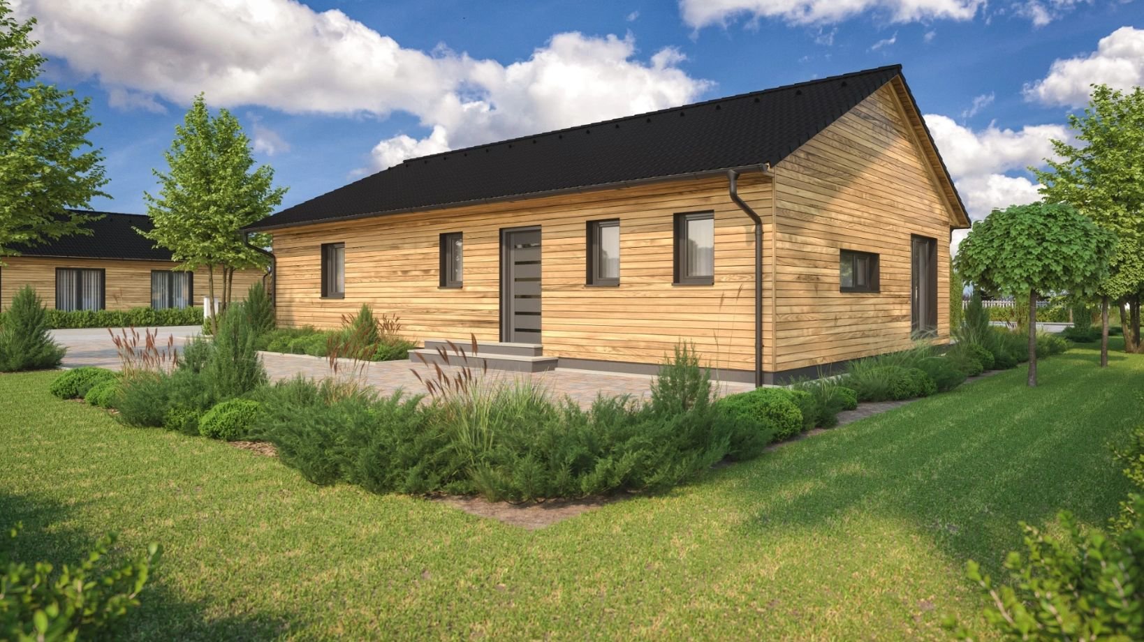 Jednoduchý moderní dům bude dobře vypadat v nové i starší zástavbě. Vyžaduje delší obdélníkový nebo velký čtvercový pozemek. Poskytne pohodlné bezbariérové rodinné bydlení, má velký společný obývací prostor, průchozí do ložnicové části. Z každého pokoje se dá vyjít přímo na zahradu. Výhodou je i úsporný provoz.