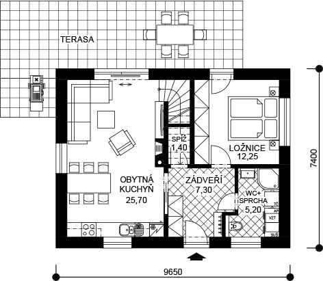 V přízemí je vstupní zádveří, ze kterého je přístupná obytná kuchyň se schodištěm do podkroví, ložnice, spíž a WC + sprcha s pračkou, sušičkou, zdrojem tepla a vzduchotechnickou jednotkou. Z obývacího pokoje a ložnice je vstup na terasu. V podkroví jsou dva pokoje, lázeň s WC a komora.