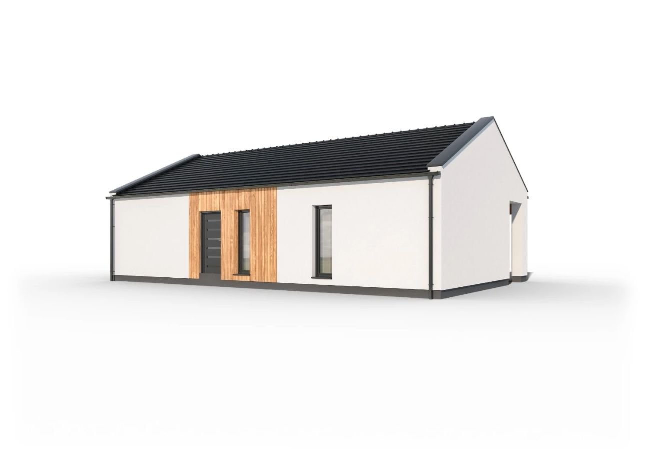 Jednoduchý bezbariérový dům poskytne praktické bydlení za výhodnou cenu a s nízkými provozními náklady. Hodí se do městské i venkovské zástavby, má příjemnou krytou terasu a francouzská okno z pokojů přímo na zahradu. Určitou daní za úspornost je malá koupelna bez vany, navíc spojená s tech. místností.