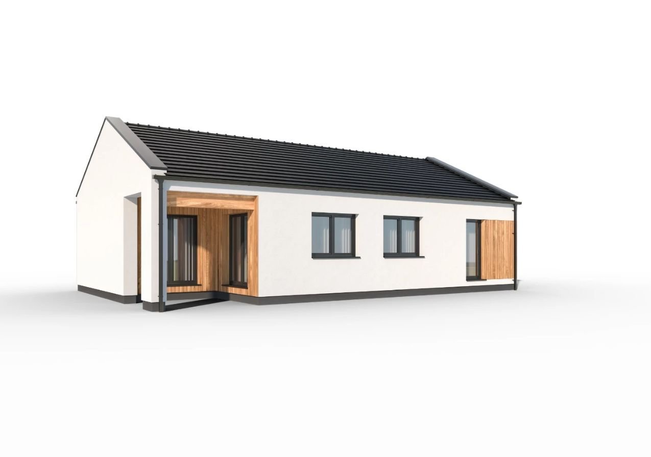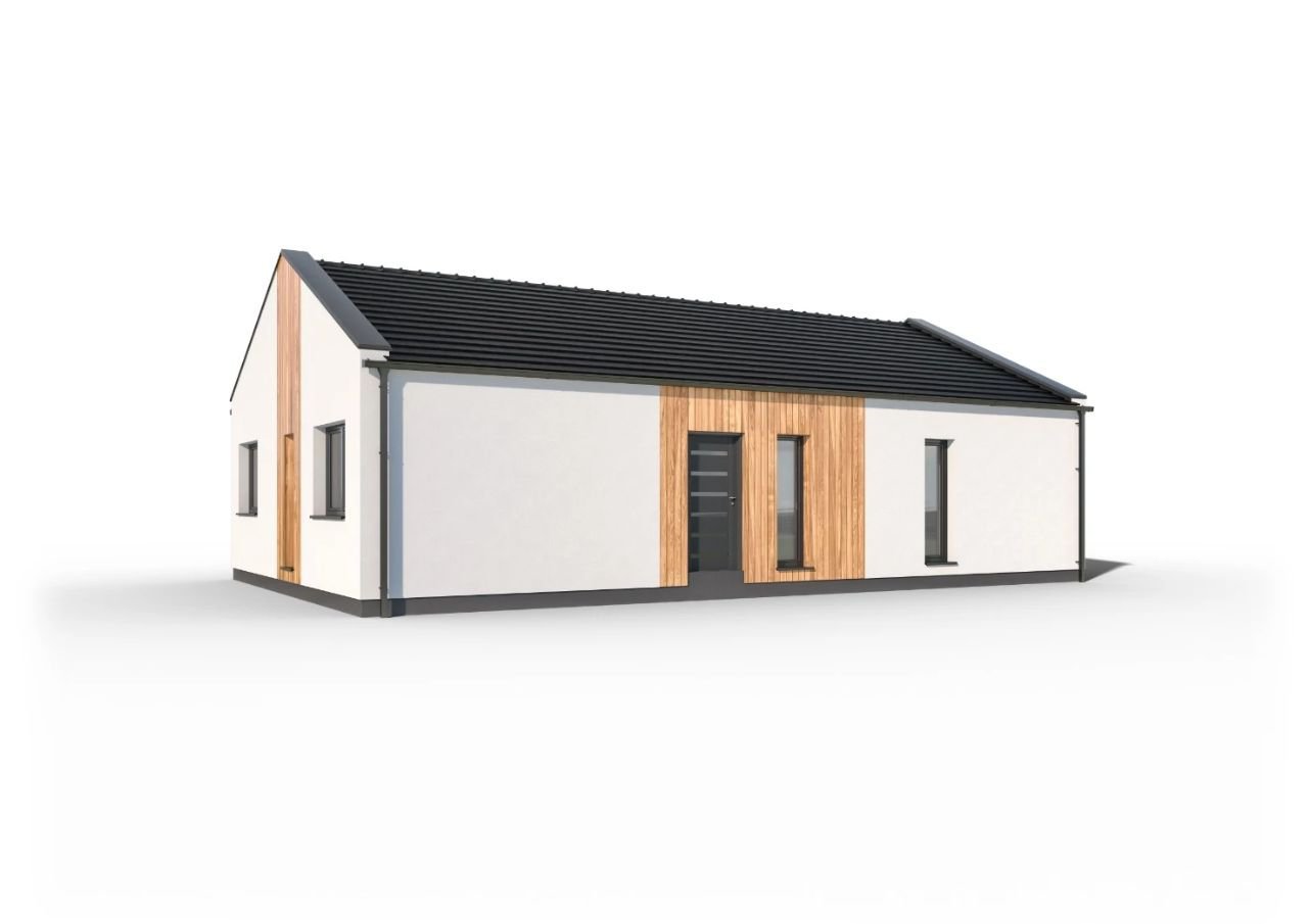 Jednoduchý bungalov se sedlovou střechou je určen pro praktické bydlení čtyřčlenné rodiny. Má komfortní zázemí a oblíbenou krytou rohovou... terasu. Dětské pokoje jsou odděleny od ložnice rodičů a nabízejí soukromí. Kuchyň se zdá pro čtyřčlennou rodinu poměrně malá.