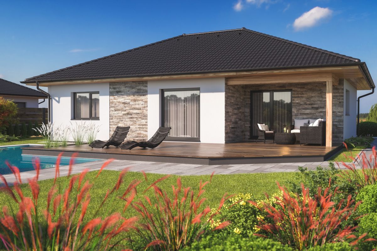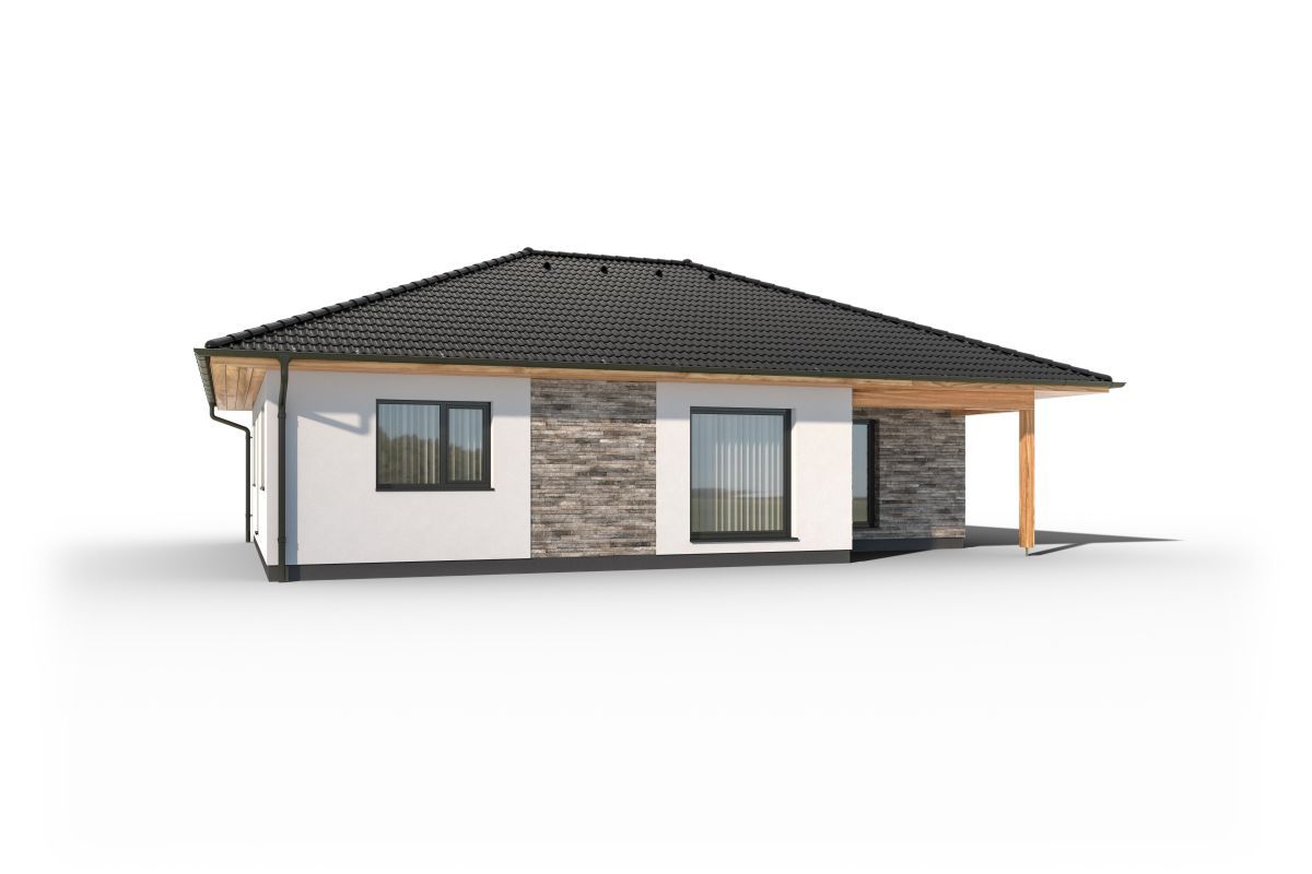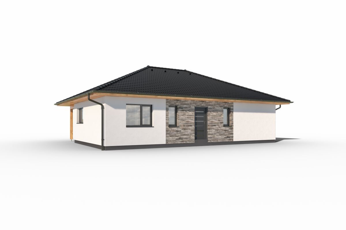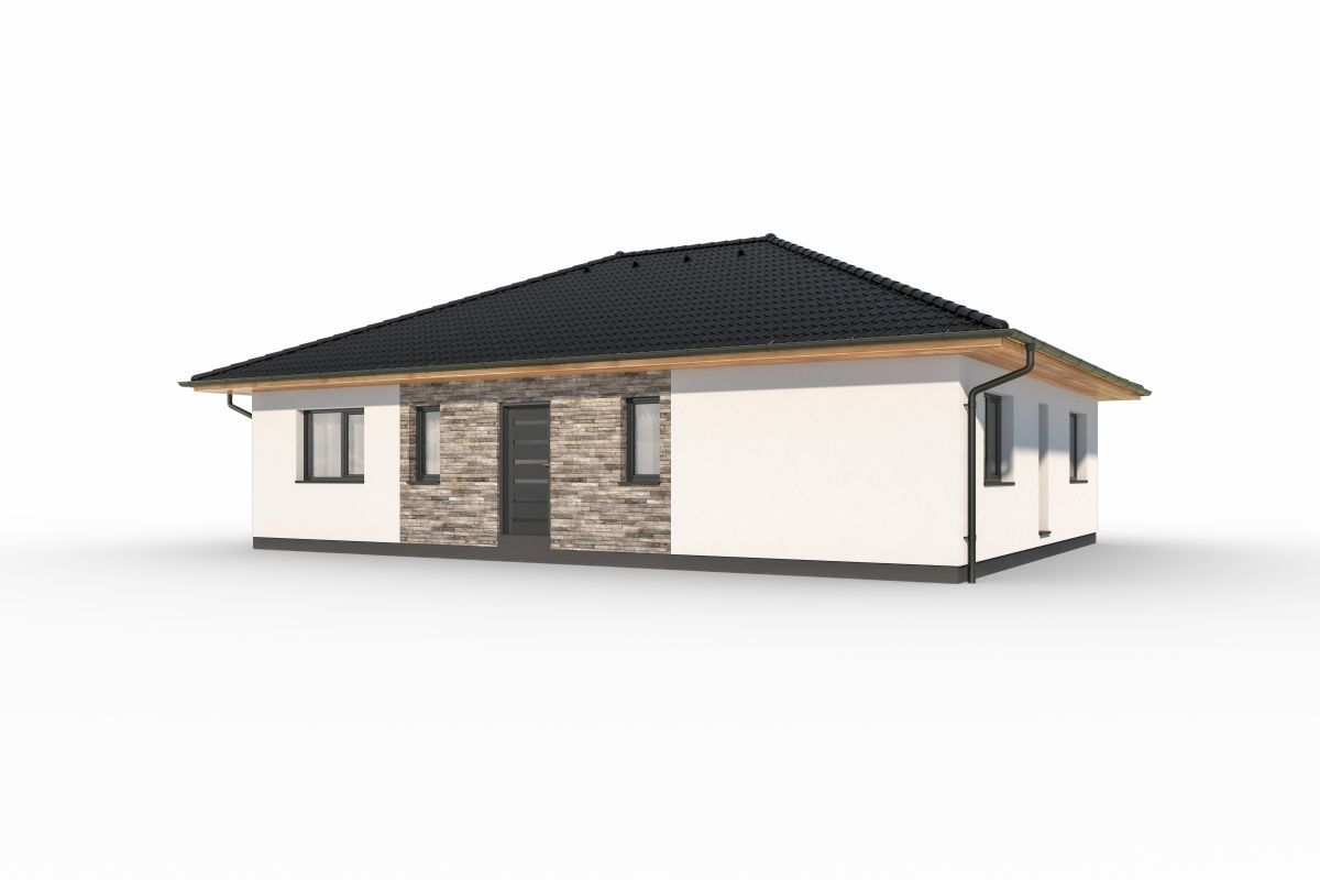 Jednoduchý bezbariérový dům poskytne praktické bydlení za výhodnou cenu a s nízkými provozními náklady. Hodí se do městské i venkovské zástavby, má příjemnou krytou terasu a francouzská okno z pokojů přímo na zahradu. Určitou daní za úspornost je malá koupelna bez vany, navíc spojená s tech. místností.