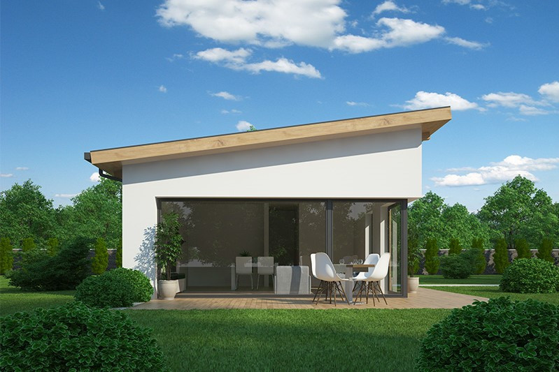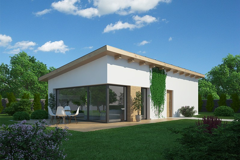 Tento bungalov díky originálnímu řešení střechy vybočuje ze stereotypu a nabízí praktické a zároveň úsporné bydlení tříčlenné rodině nebo dvojici. Bude dobře vypadat ve městě i na venkově. K výhodám patří prostorné zádveří, vyvážená velikost místností, přehledná dispozice, příjemná bude jistě i krytá terasa.