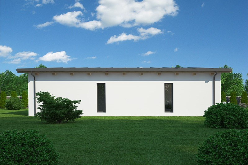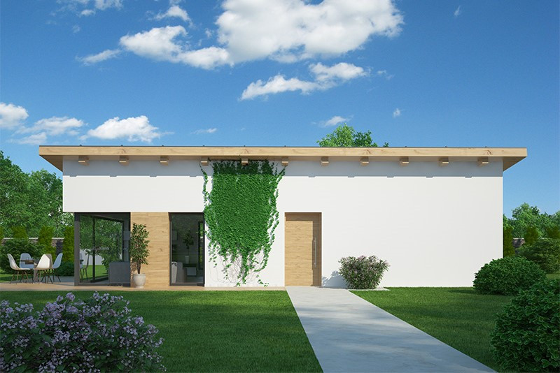 Jednopodlažní dům o dispozici 3 + kk + g je vhodným řešením pro rodiny uvažující o jednom dítěti či jako řešení bydlení na stáří. Dům má půdorys tvaru L, kdy je dispozičně dělen na společenskou a klidovou zónu.
