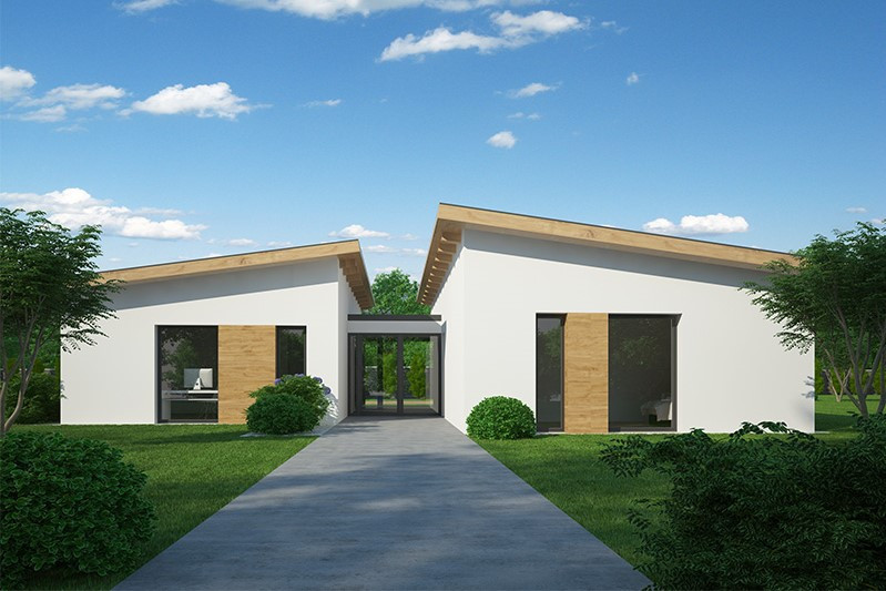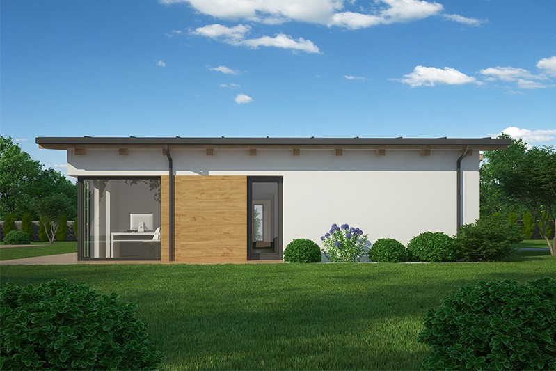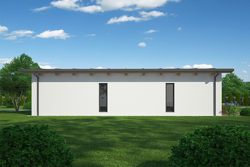 Jedná se o pohodlné bezbariérové bydlení za výhodnou cenu pro čtyřčlennou rodinu. Účelná dispozice umožňuje vytvořit chráněnou rohovou terasu. Ze zádveří se přes chodbu vstupuje přímo do společné obývací části, která je rozdělena na kuchyň s jídelnou a obývací pokoj s výstupem na terasu. Dům je určen pro rovinatý pozemek, doporučuje se, aby hlavní hřeben střechy byl rovnoběžný s osou přístupové komunikace.