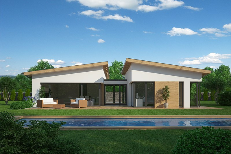 Bungalov s dispozicí ve tvaru písmene L se řadí mezi nejoblíbenější typy rodinných domů u nás. Oddělená denní a noční zóna s vlastním zázemím zajišťují pohodlný provoz domácnosti. K výhodám patří i rohová terasa a integrovaná garáž propojená se zádveřím.