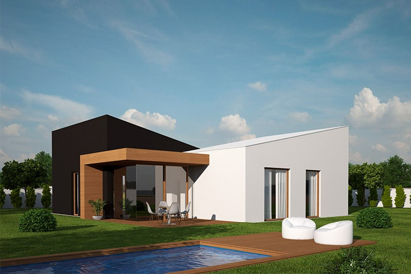 Jednopodlažní dům o dispozici 3 + kk + g je vhodným řešením pro rodiny uvažující o jednom dítěti či jako řešení bydlení na stáří. Dům má půdorys tvaru L, kdy je dispozičně dělen na společenskou a klidovou zónu.