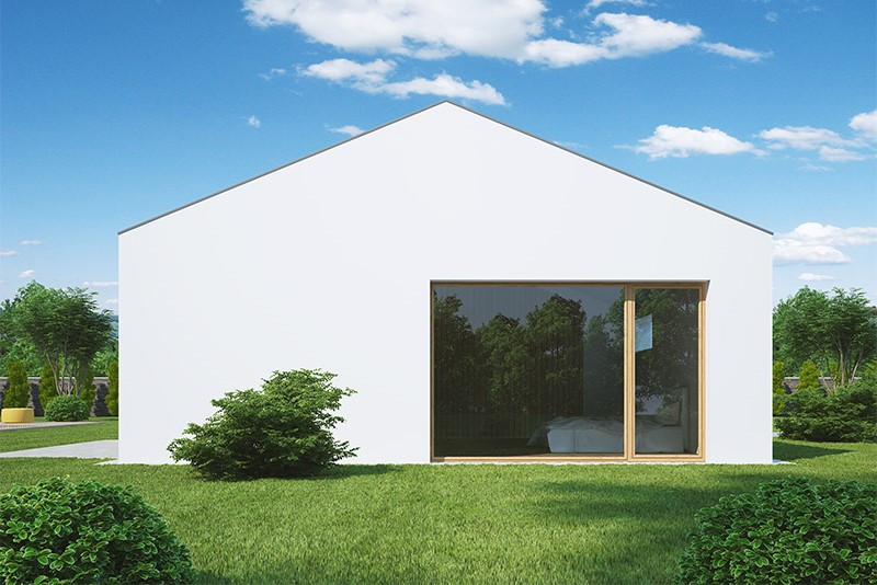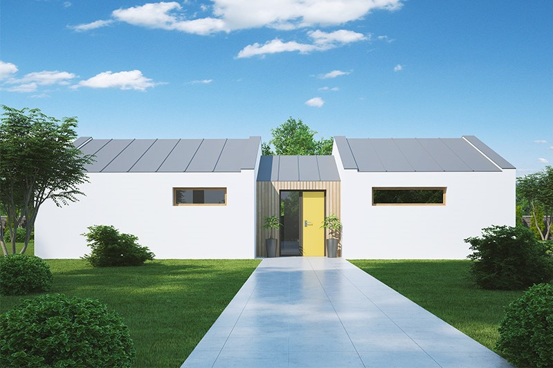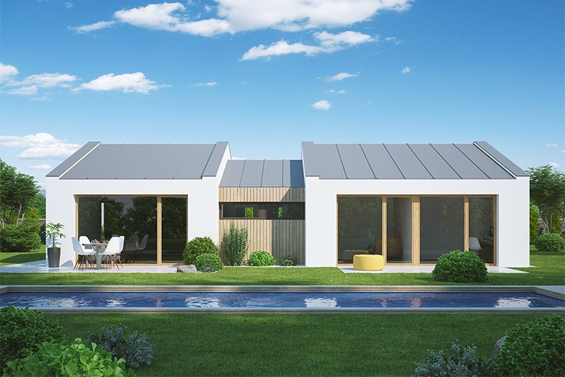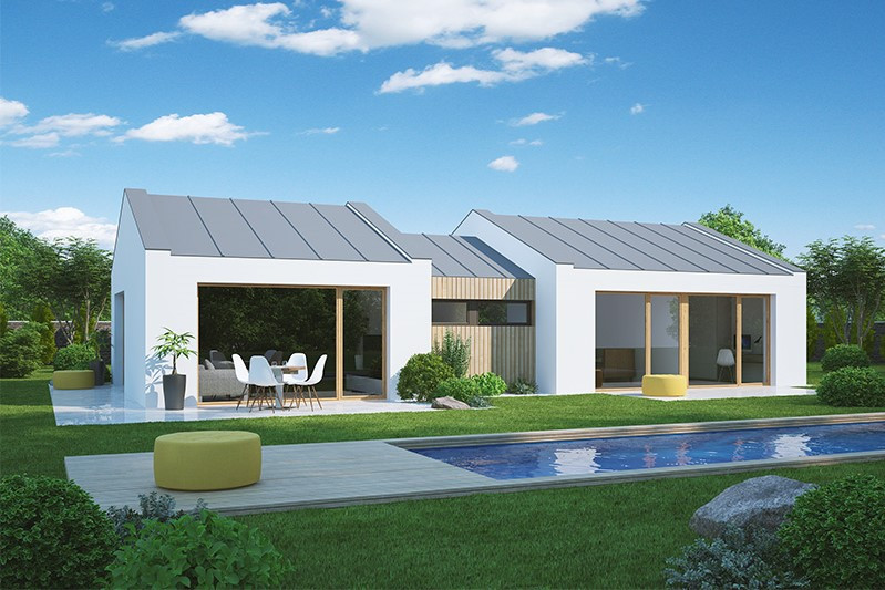Moderní úsporný dům nabízí praktické bydlení za přijatelnou cenu. Centrem je obývací pokoj s kuchyní a prosklenou stěnou do zahrady. Rozděluje dispozici na dvě části – apartmá rodičů a zónu s dětskými pokoji a hlavním vstupem. Obě zóny mají vlastní zázemí a navzájem se neruší.