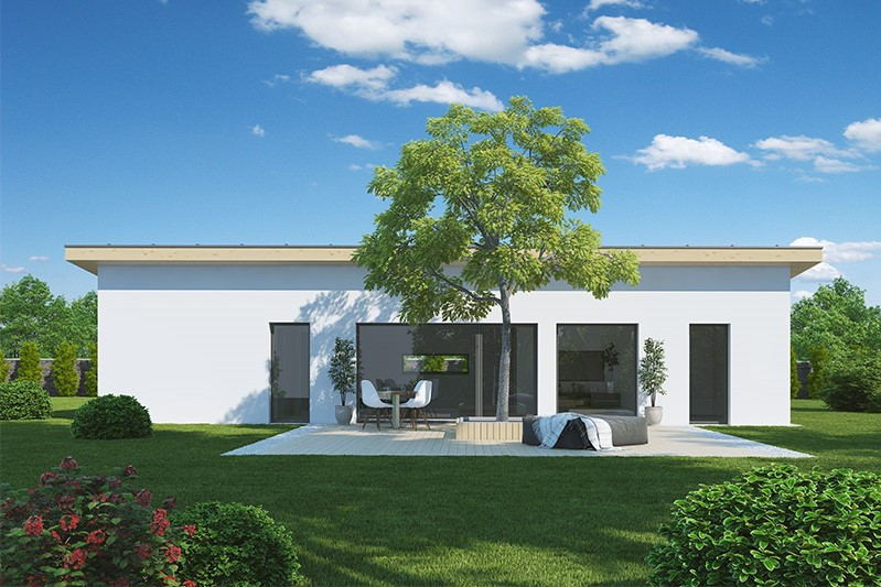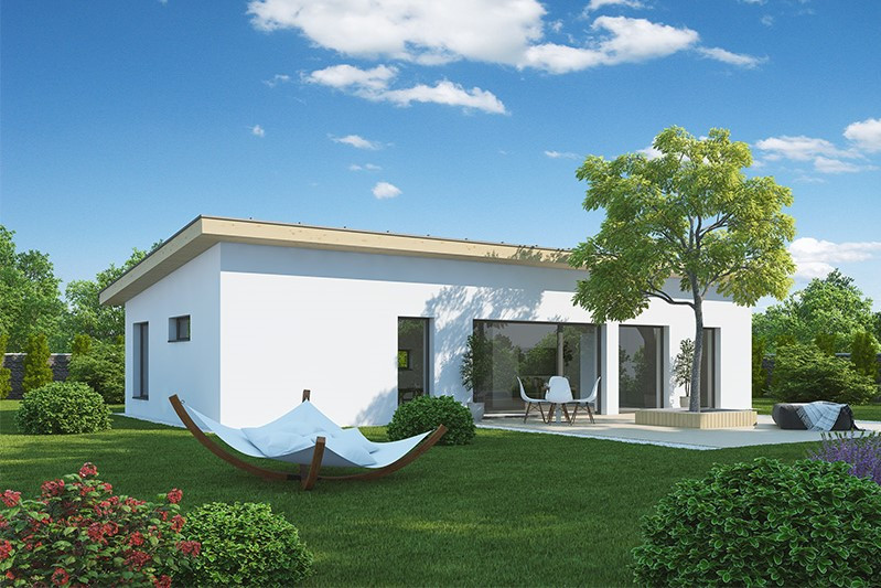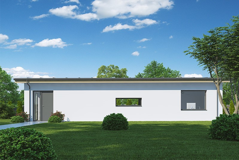Jednopodlažní dům o dispozici 3 + kk + g je vhodným řešením pro rodiny uvažující o jednom dítěti či jako řešení bydlení na stáří. Dům má půdorys tvaru L, kdy je dispozičně dělen na společenskou a klidovou zónu.