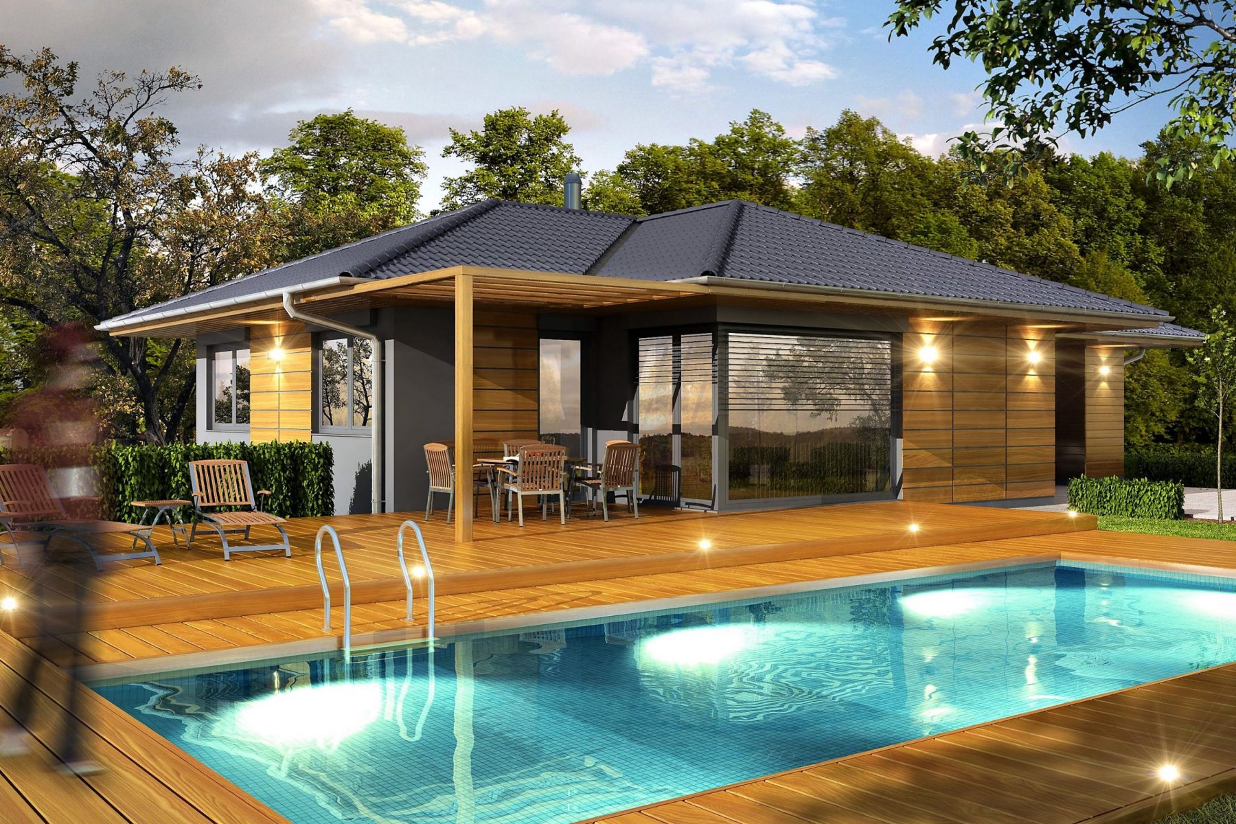 Jednoduchý bezbariérový dům poskytne praktické bydlení za výhodnou cenu a s nízkými provozními náklady. Hodí se do městské i venkovské zástavby, má příjemnou krytou terasu a francouzská okno z pokojů přímo na zahradu. Určitou daní za úspornost je malá koupelna bez vany, navíc spojená s tech. místností.