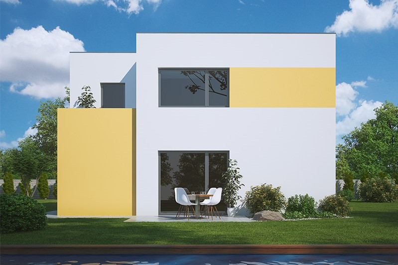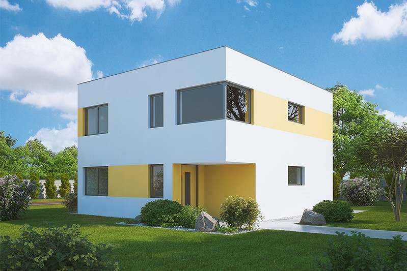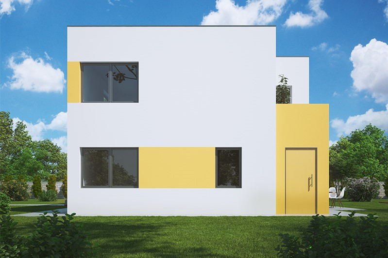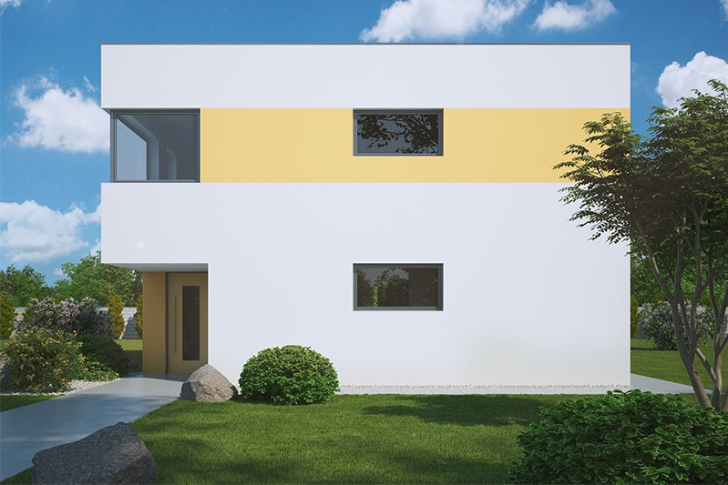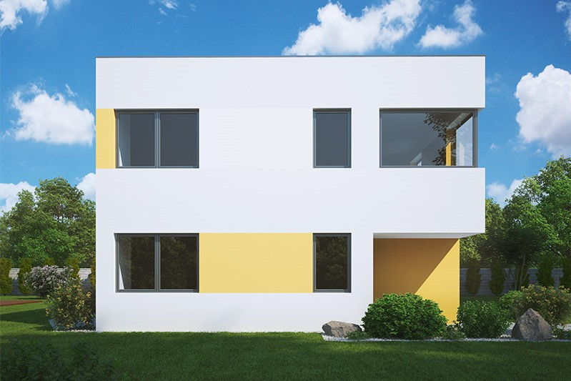 Elegantní moderní dům, vhodný především do města, do nové zástavby, postačí pro něj malý pozemek. Zvenčí zaujme kombinace hladké bíl... a barevné omítky s prosklenými plochami, uvnitř nabízí překvapivě velkou užitnou plochu. V přízemí je praktická hala s řadou vestavěných skříní, společný obývací prostor s částečně oddělenou kuchyní, ložnice pro 1 osobu (případně pokoj pro návštěvy) a koupelna. Na nároží je malá místnost přístupná ze zahrady. V patře se nachází velká hlavní ložnice s vlastní šatnou, rohovou terasou a koupelnou, 2 dětské pokoje, dětská koupelna a v hale malá pracovna. V domě najde pohodlné moderní a zároveň úsporné bydlení čtyř až pětičlenná rodina.