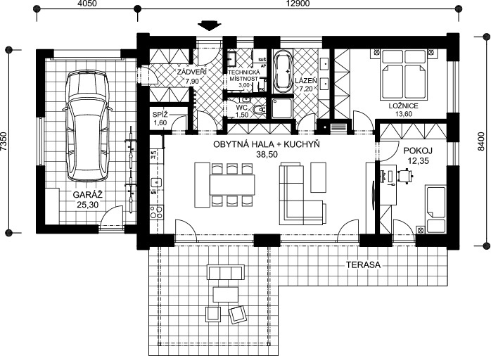 Dispozice domu se hodí jak pro starší klienty, pro které by byl větší obytný prostor již nadbytečný, tak pro mladou rodinu s jedním dítětem. Hlavní část domu je oddělena od garáže vstupním prostorem. Tento je však plně krytý střechou, a vytváří tak dokonalé zázemí pro vstup nejen do domu, ale i do zahrady.