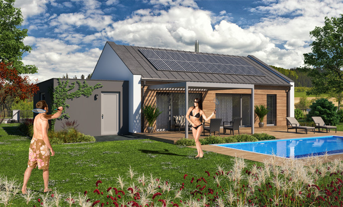 Moderní úsporný dům nabízí praktické bydlení za přijatelnou cenu. Centrem je obývací pokoj s kuchyní a prosklenou stěnou do zahrady. Rozděluje dispozici na dvě části – apartmá rodičů a zónu s dětskými pokoji a hlavním vstupem. Obě zóny mají vlastní zázemí a navzájem se neruší.